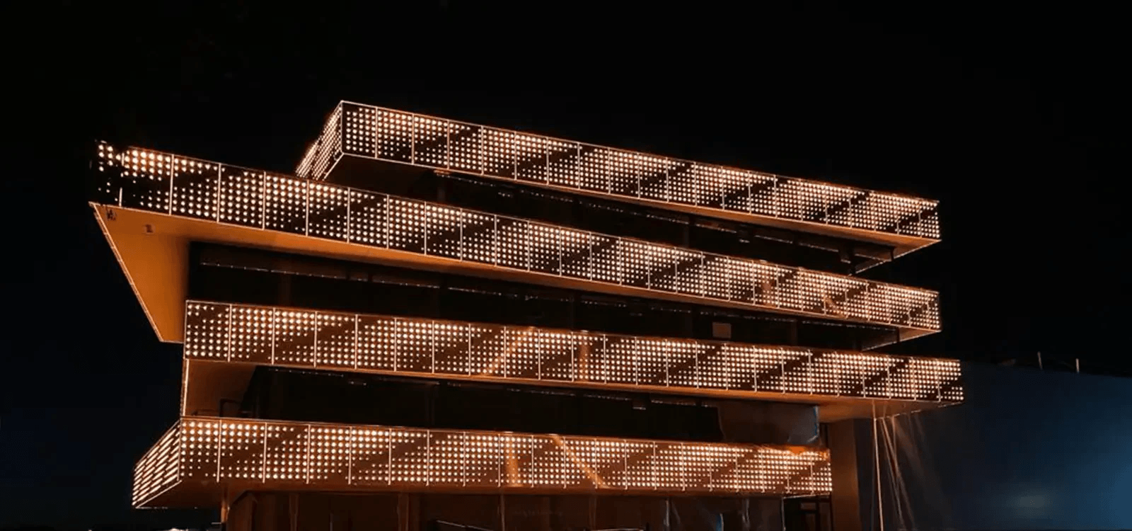 Achter het perforatiepatroon is LED-verlichting bevestigd, wat de gevelbekleding oplicht nóg levendiger maakt.