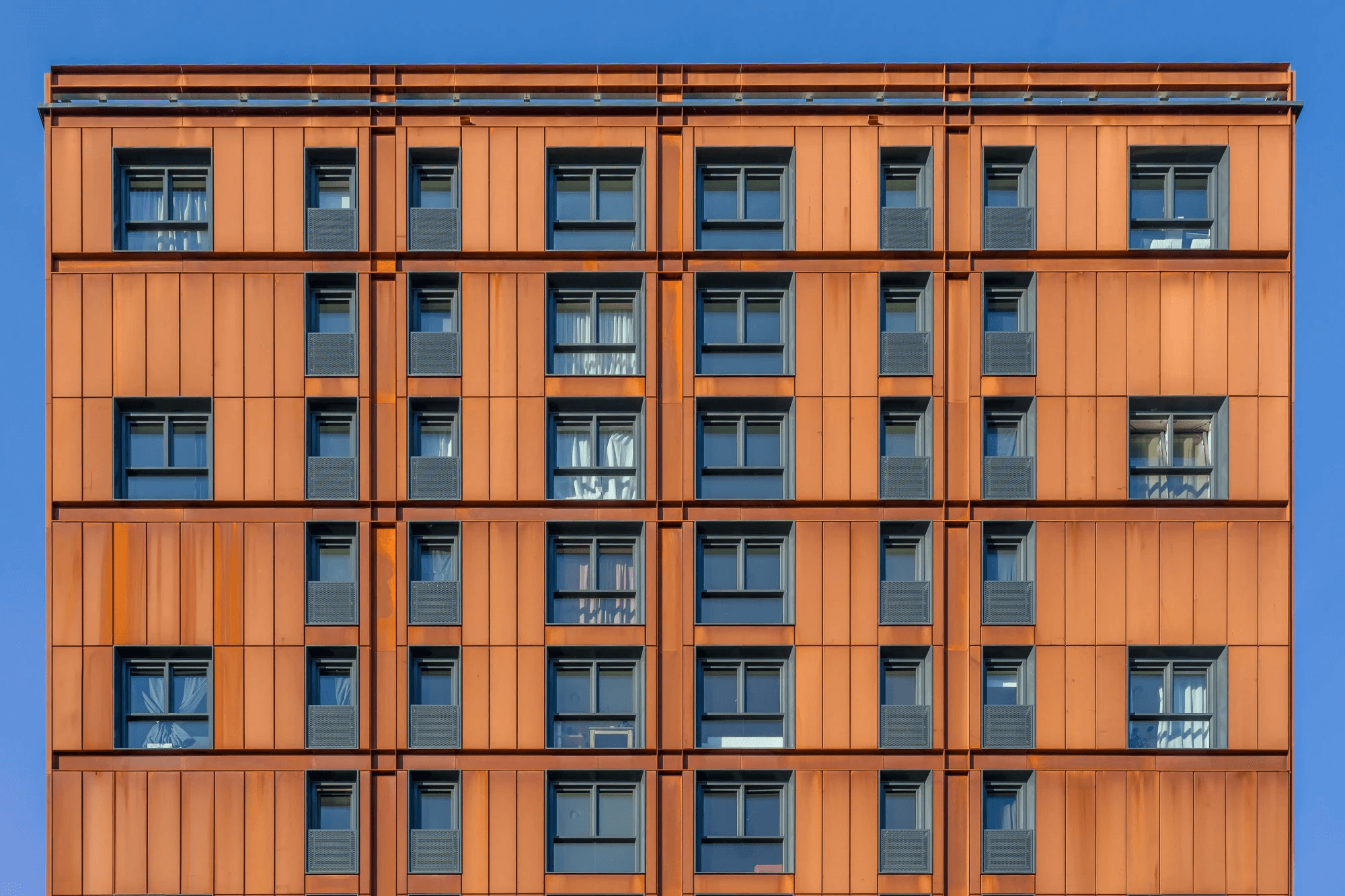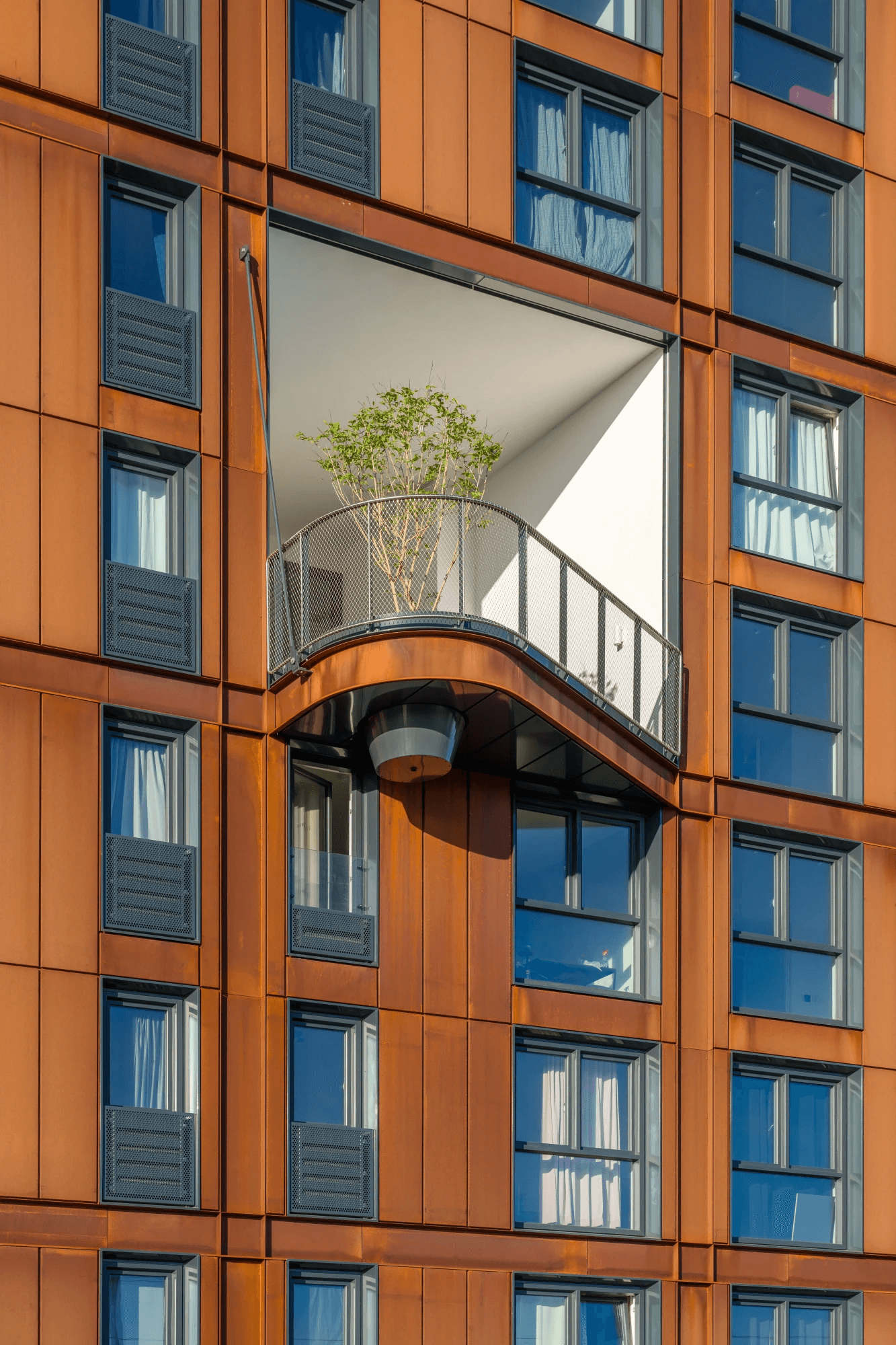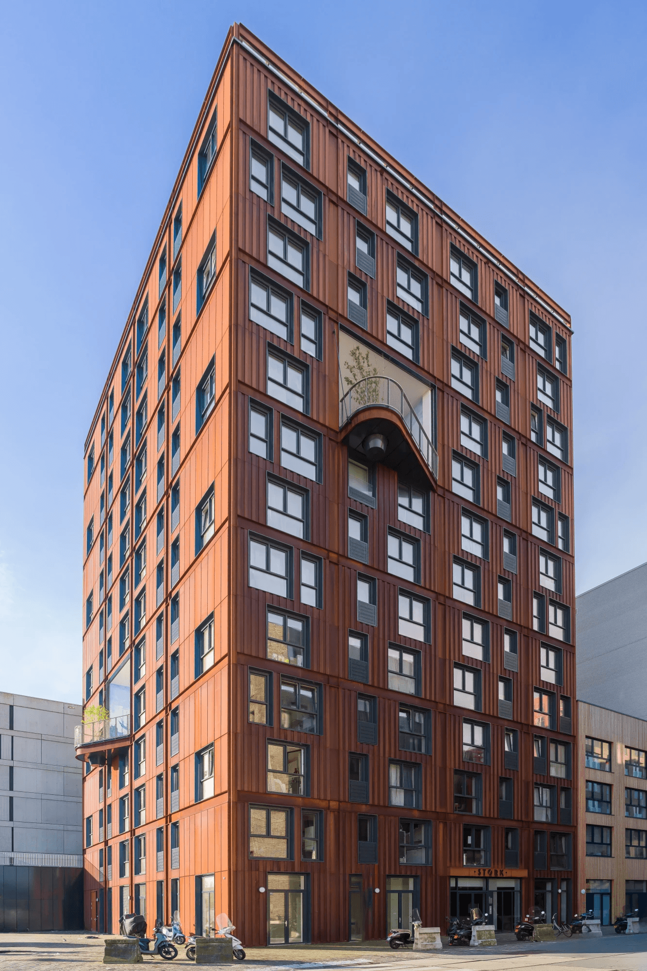 Wat is rood, roest en robuust? Juist, woontoren Kavel 6 op Oostenburgeiland in Amsterdam. De gedetailleerde Cortenstalen gevel, met zijn grote diepgelegen ramen, passen bij de industriele esthetiek van de buurt. Een mooi contrast met het omliggende groen van de beplantte daken en collectieve buitentuin.