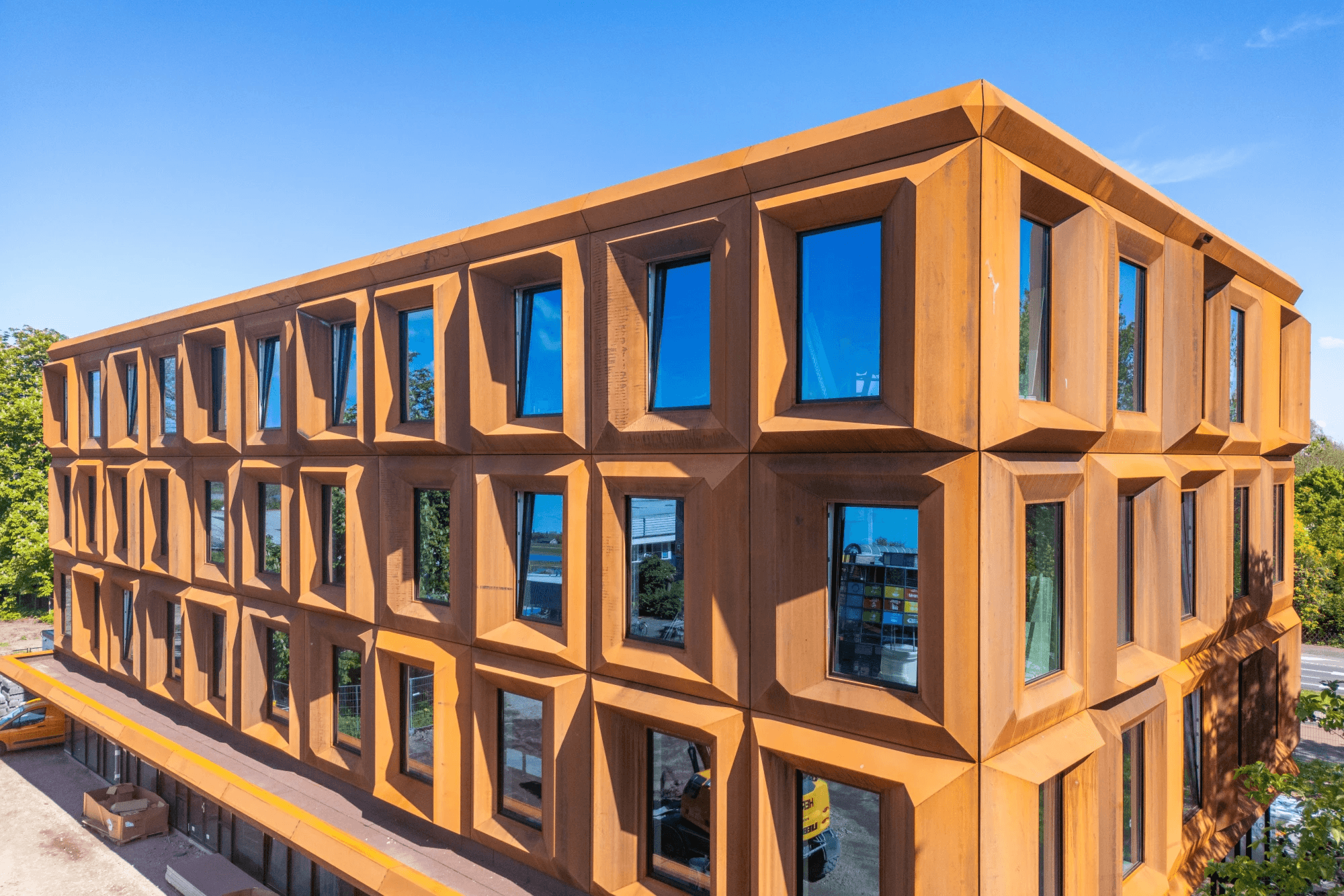 Het robuuste karakter van cortenstaal geeft een subtiele historische verwijzing naar de stalen gashouders