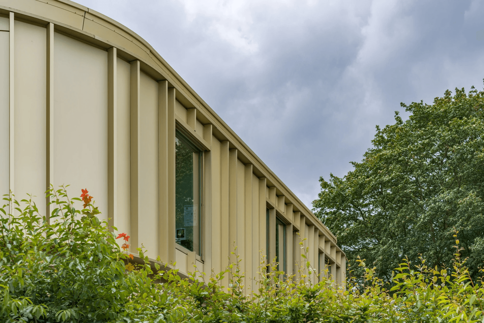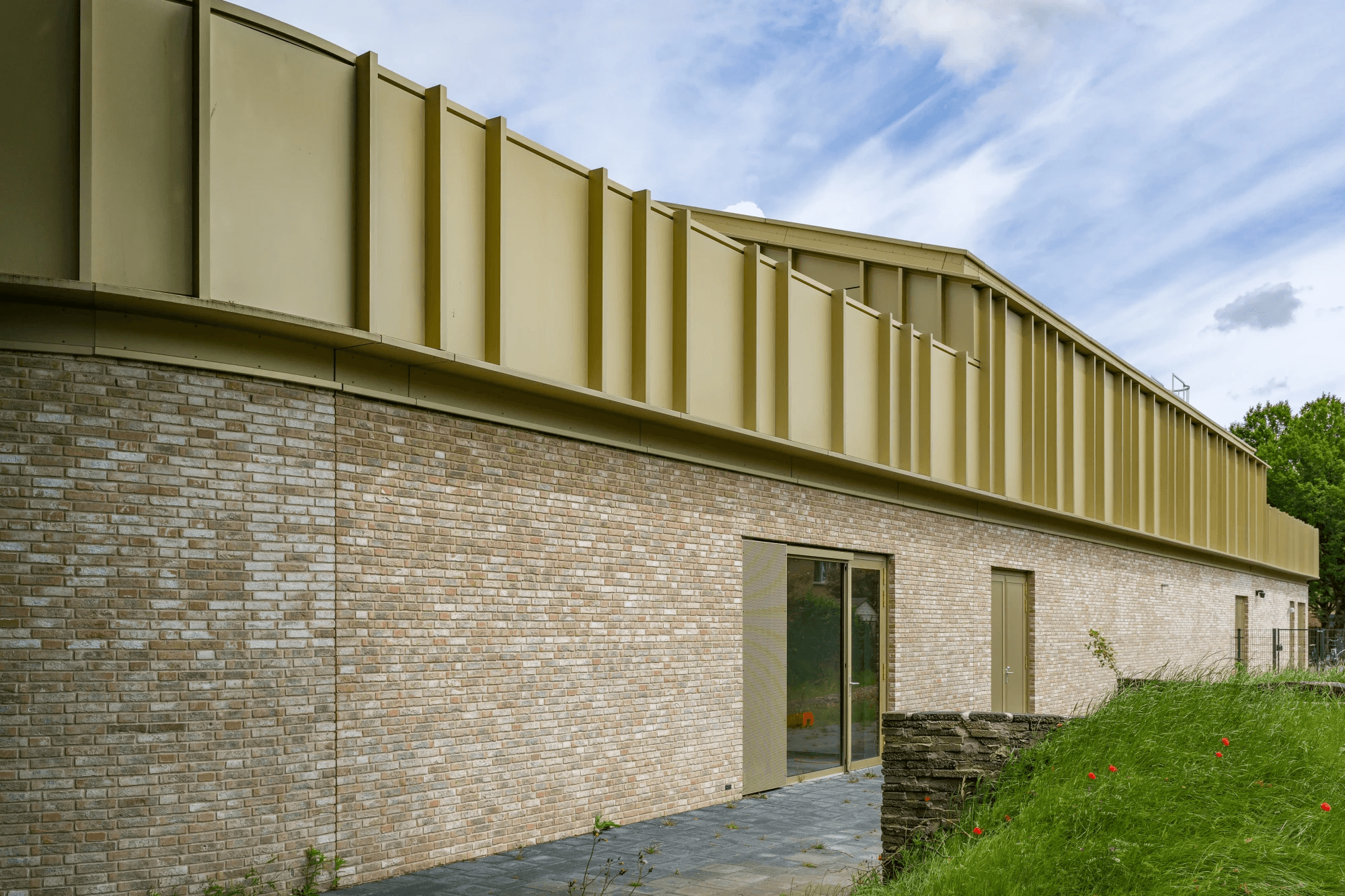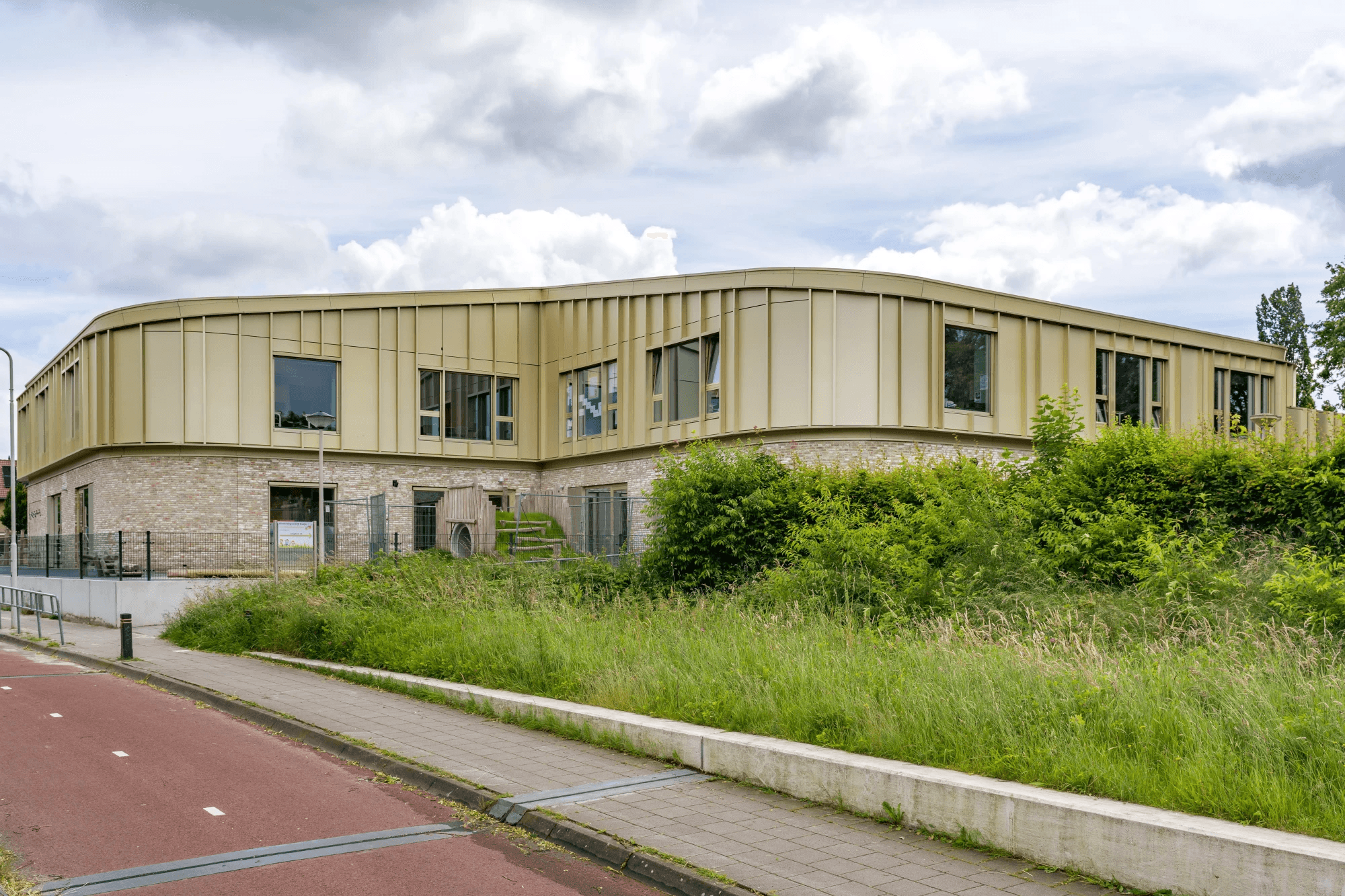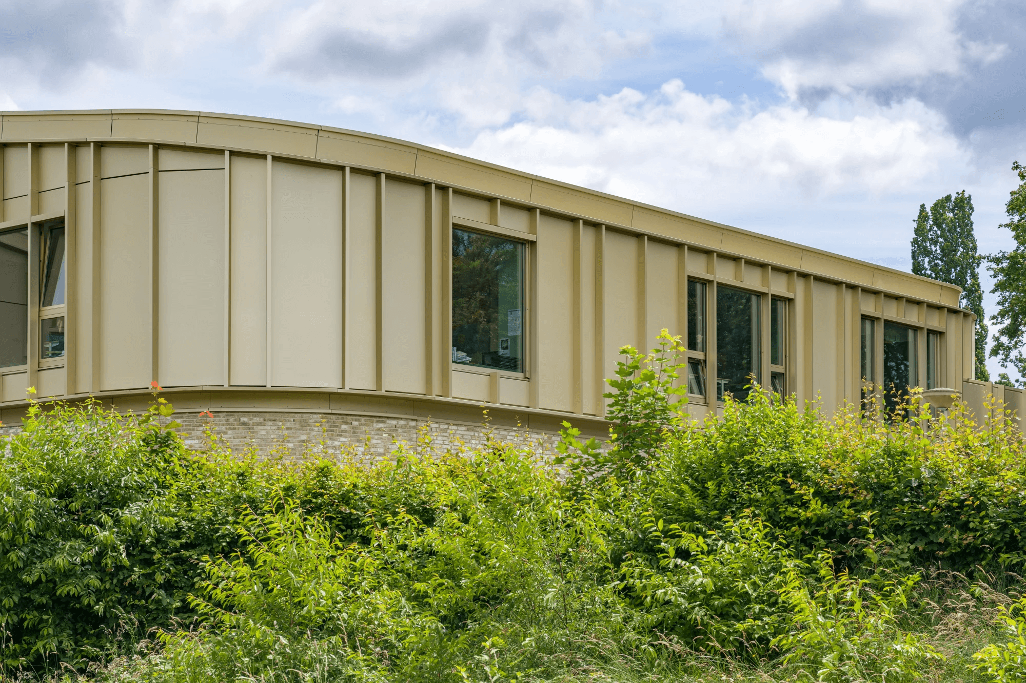 De ware eyecatcher van IKC Kroevendonk is zonder twijfel de goudkleurige geanodiseerde aluminium bekleding. Deze bijzondere afwerking geeft het gebouw een luxueuze en tijdloze uitstraling, die direct in het oog springt. Het anodiseren van het aluminium zorgt niet alleen voor de schitterende goudkleur, maar biedt ook extra bescherming tegen weersinvloeden, waardoor de gevel zijn glans behoudt gedurende vele jaren.