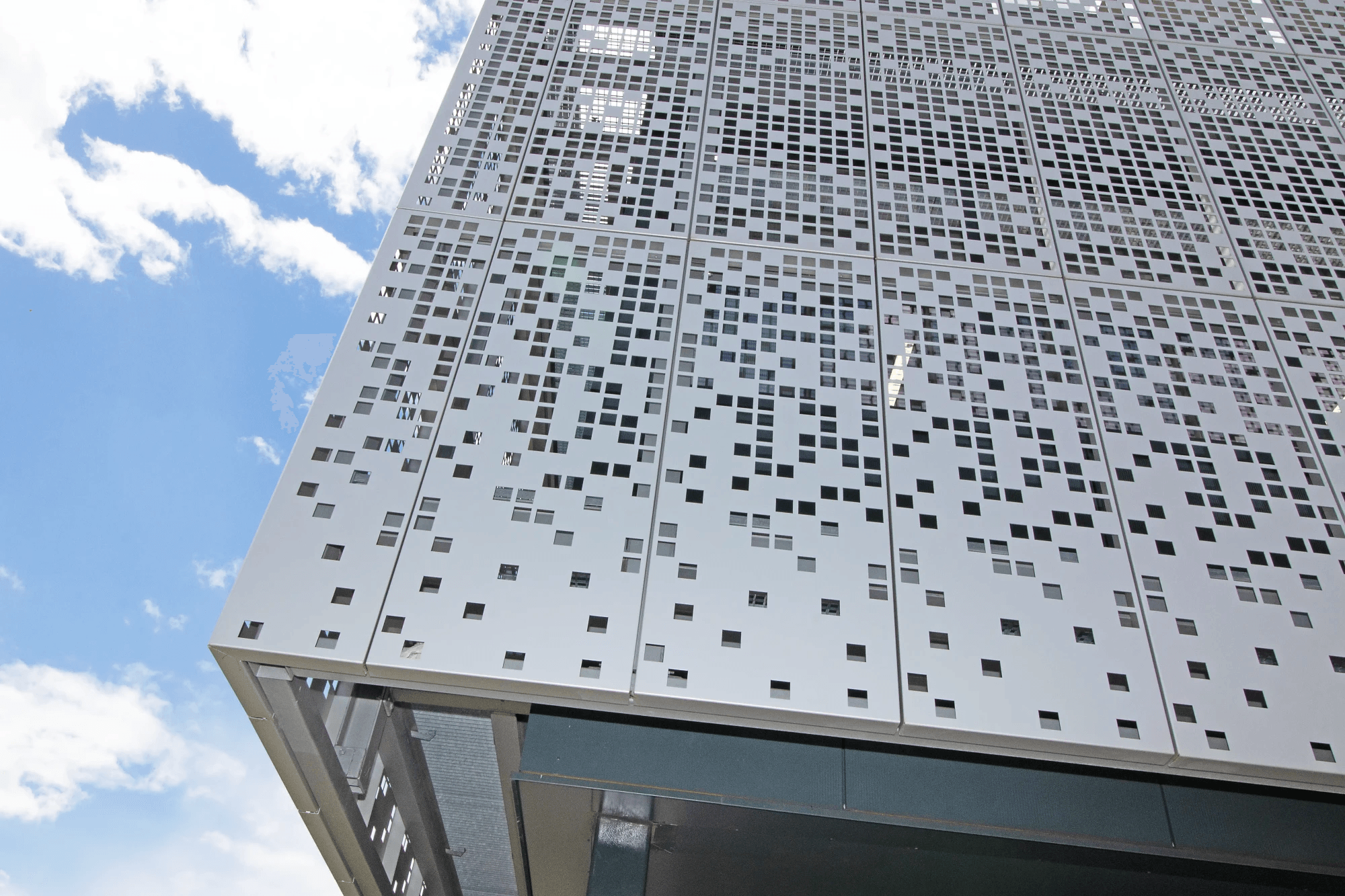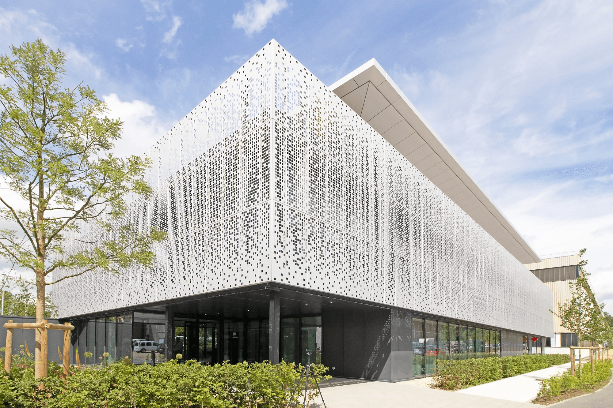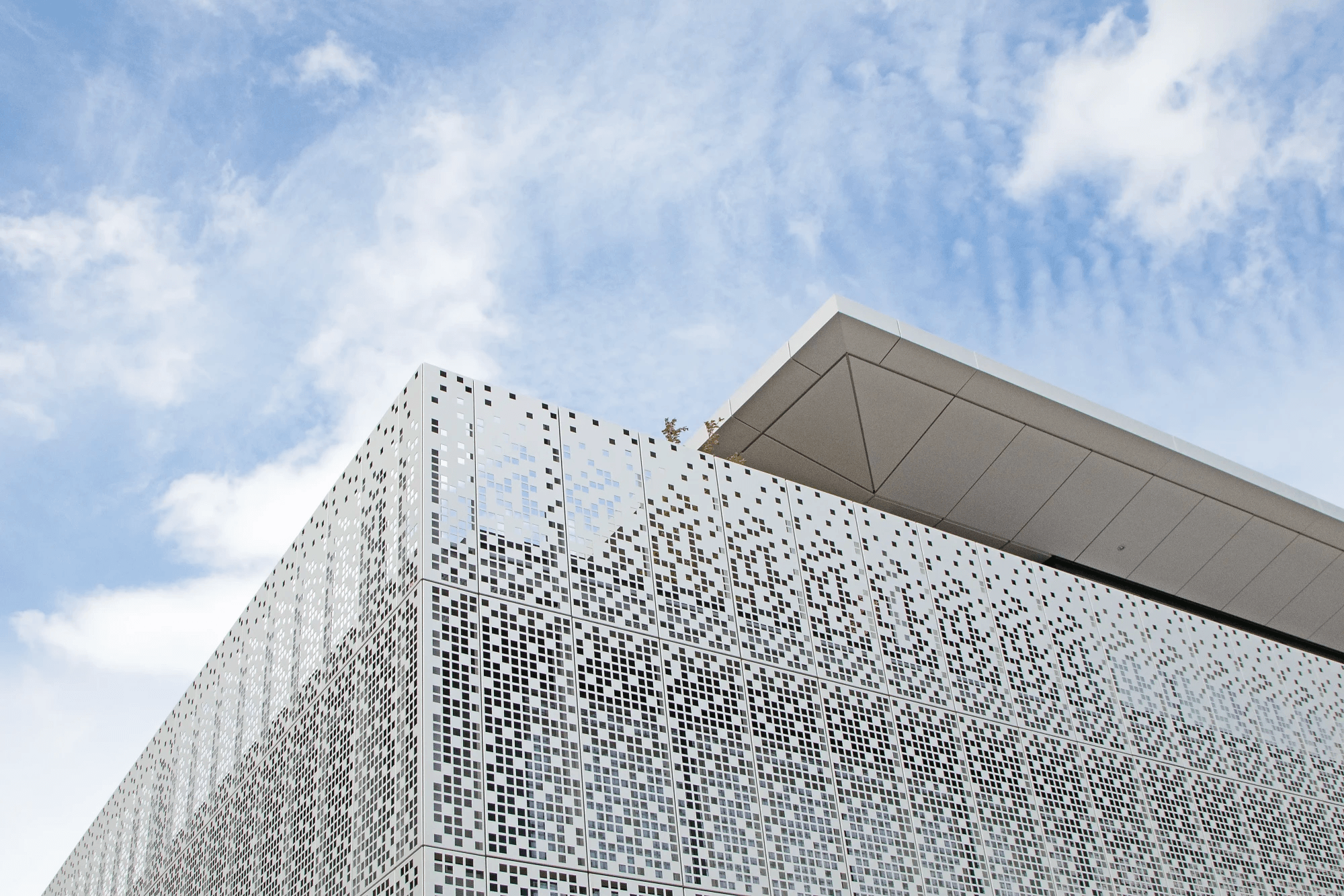 Gevelbekleding in gepoedercoat aluminium voorzien van perforatie