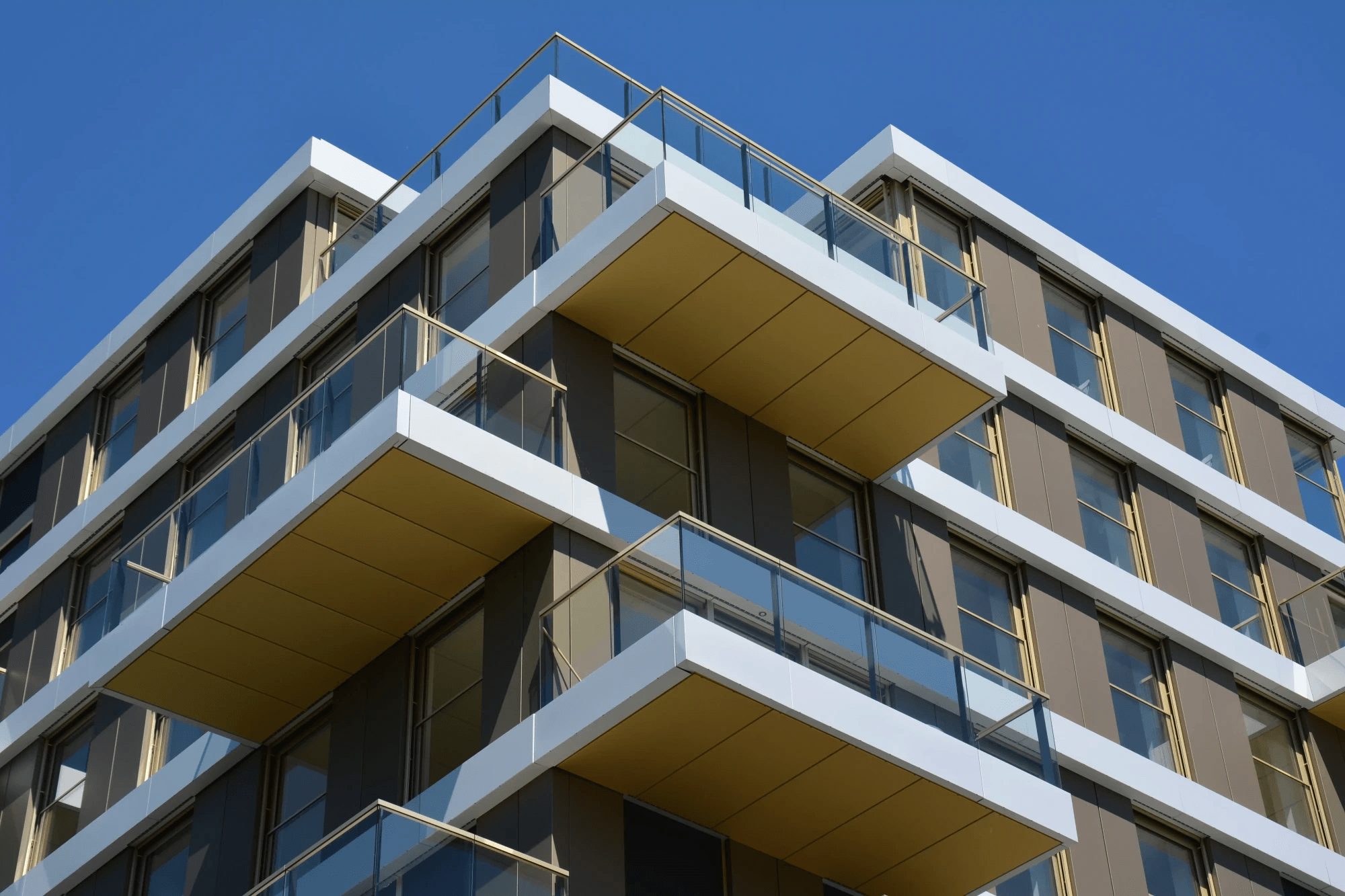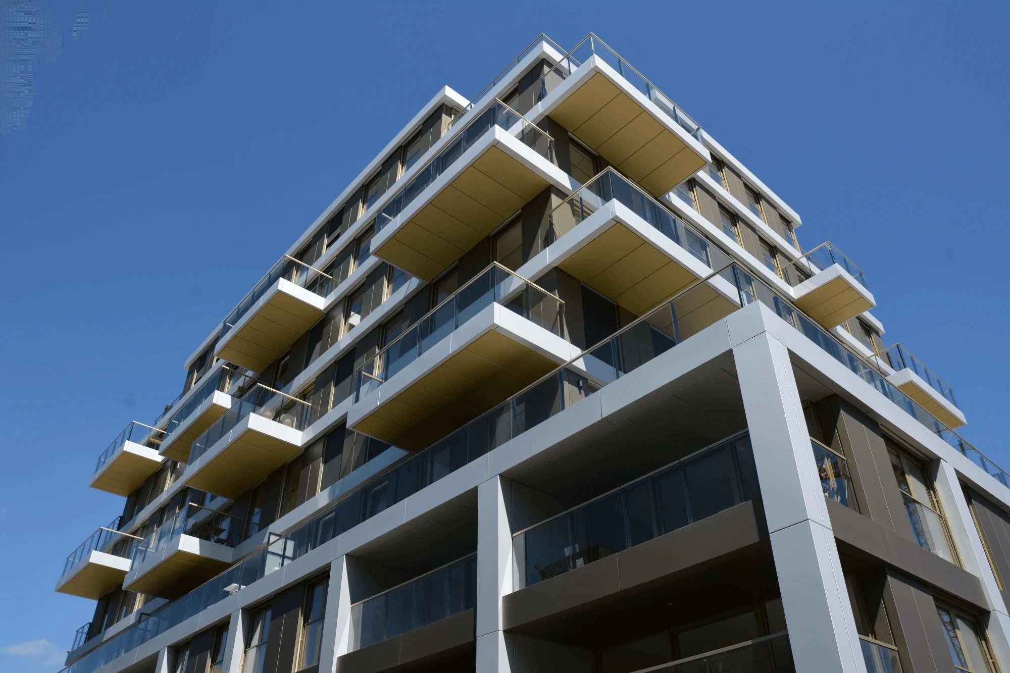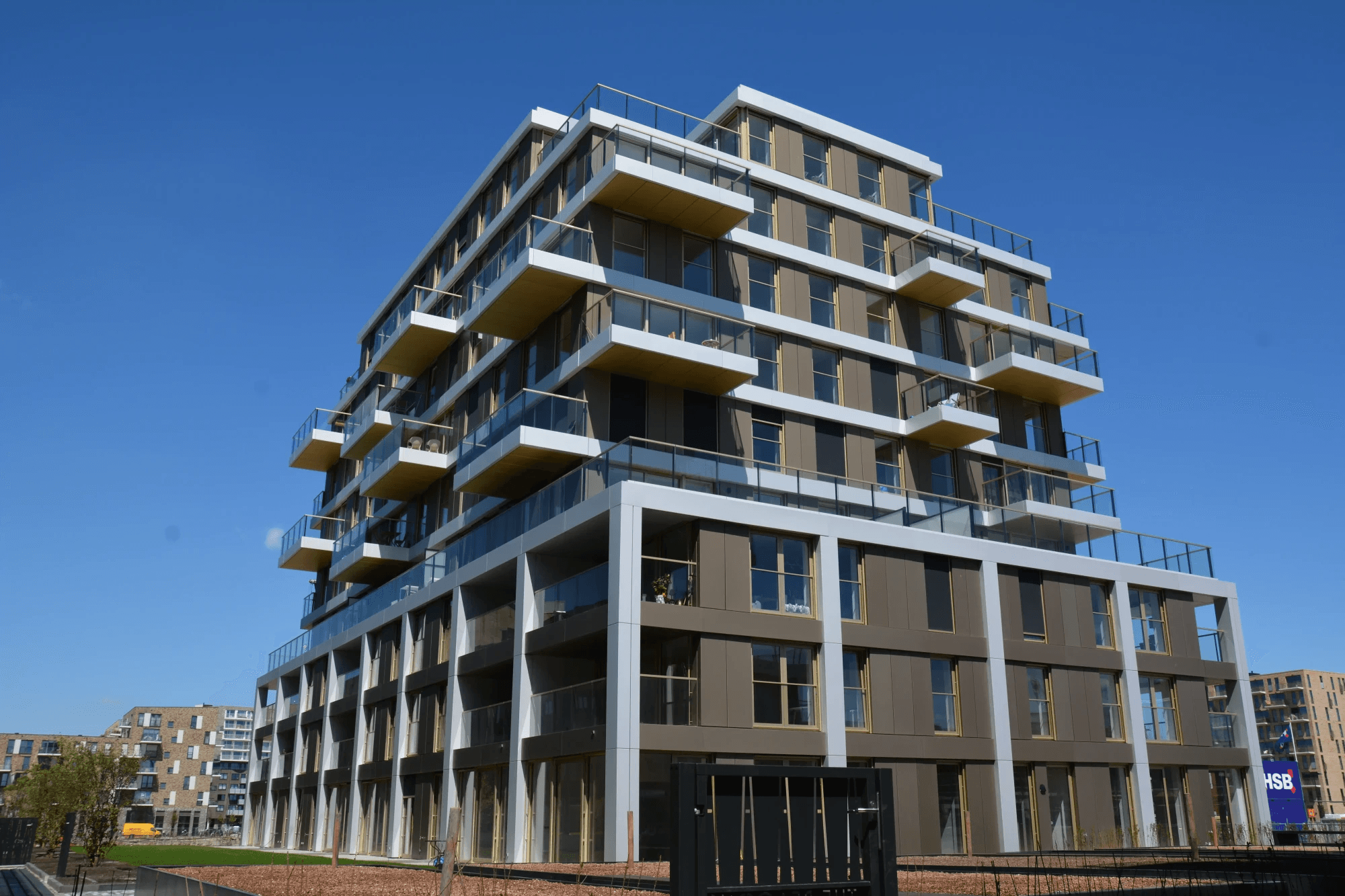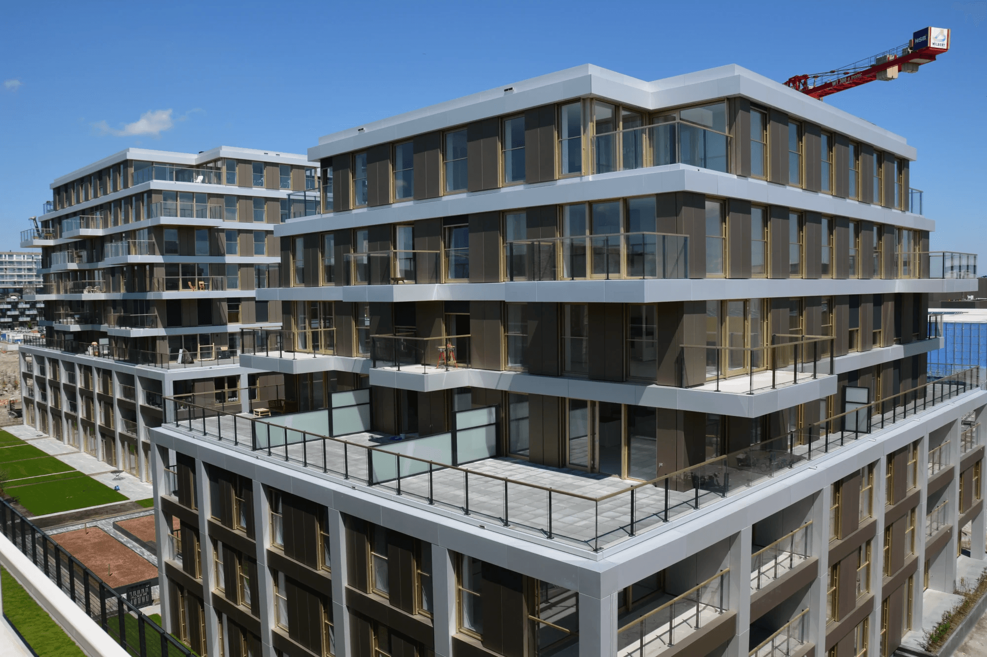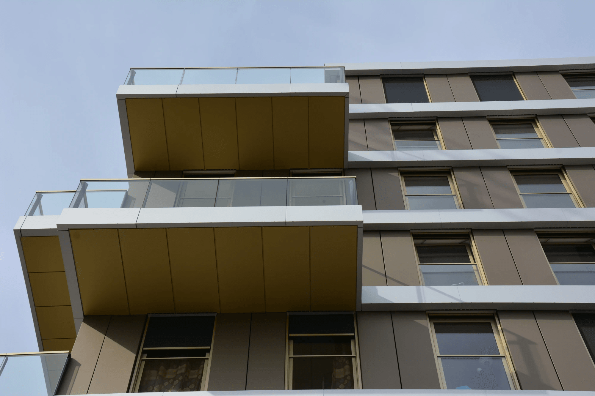 De brons-, goud- en naturel kleurige gevelbekleding zorgt ervoor dat het appartementencomplex goed past in de groene omgeving.