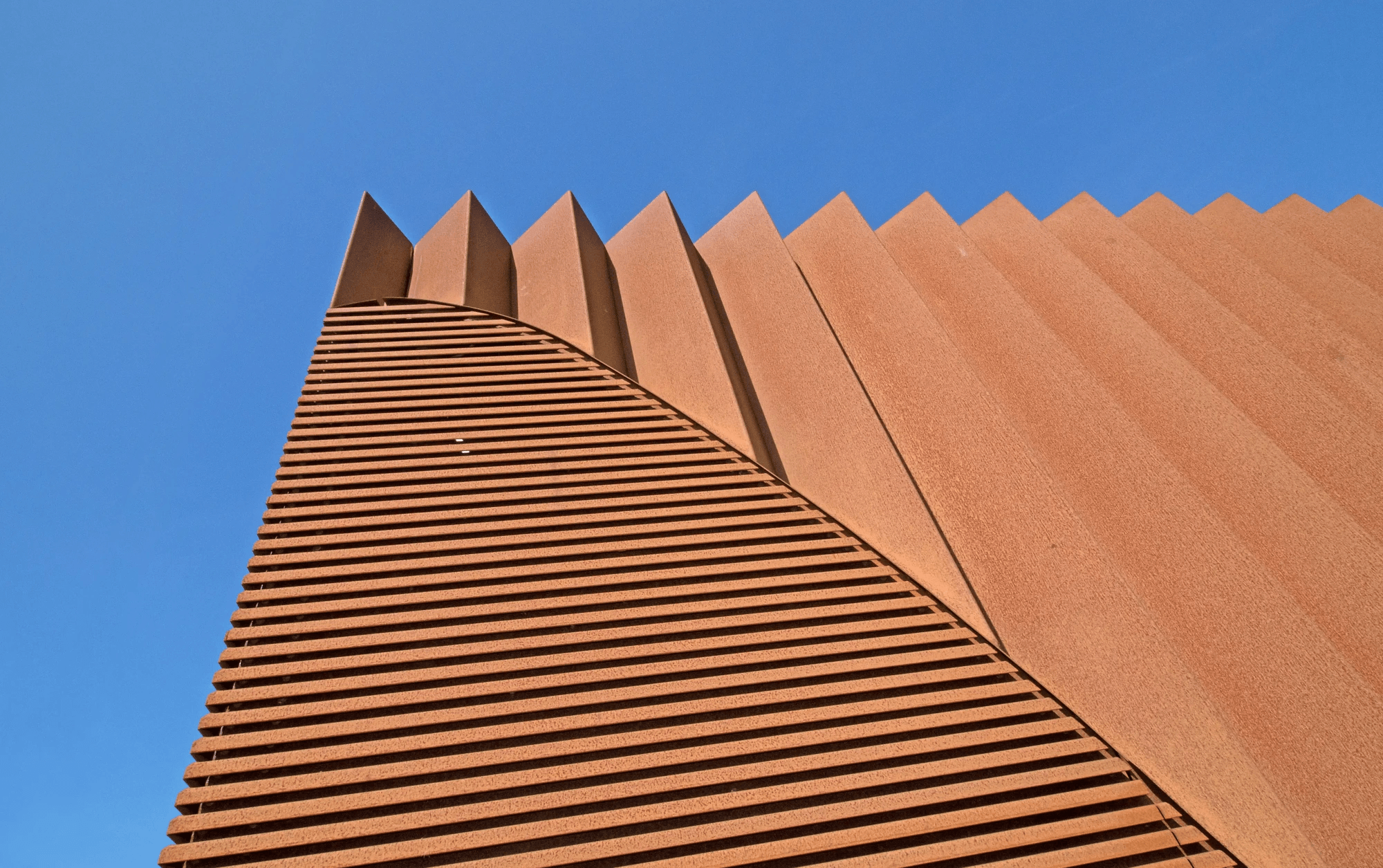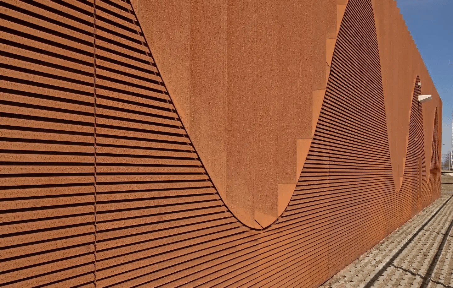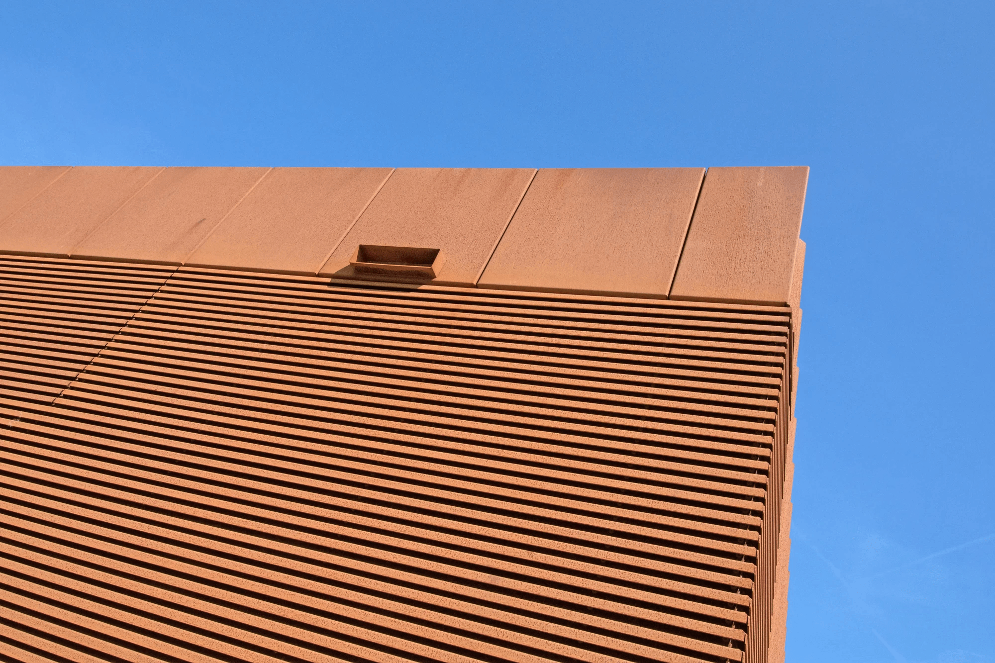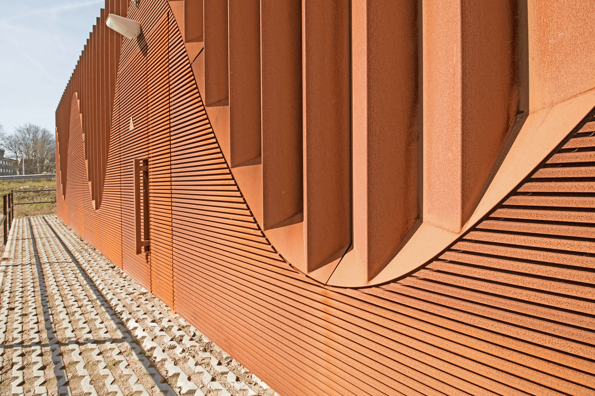 Het grafische beeld wordt bereikt door een verschil in reliëf en textuur boven en onder de lijn. De bovenkant bestaat uit asymmetrisch gevouwen Cortenstalen panelen, zodat het gebouw uit verschillende hoeken anders wordt beleefd. Voor een optimale ventilatie bestaat de gevel aan de onderzijde uit gezette roosters. Door een groot oppervlak roostergevel te maken is het dus geen probleem om tijdens het ontwerpproces of in de toekomst extra openingen te maken.
