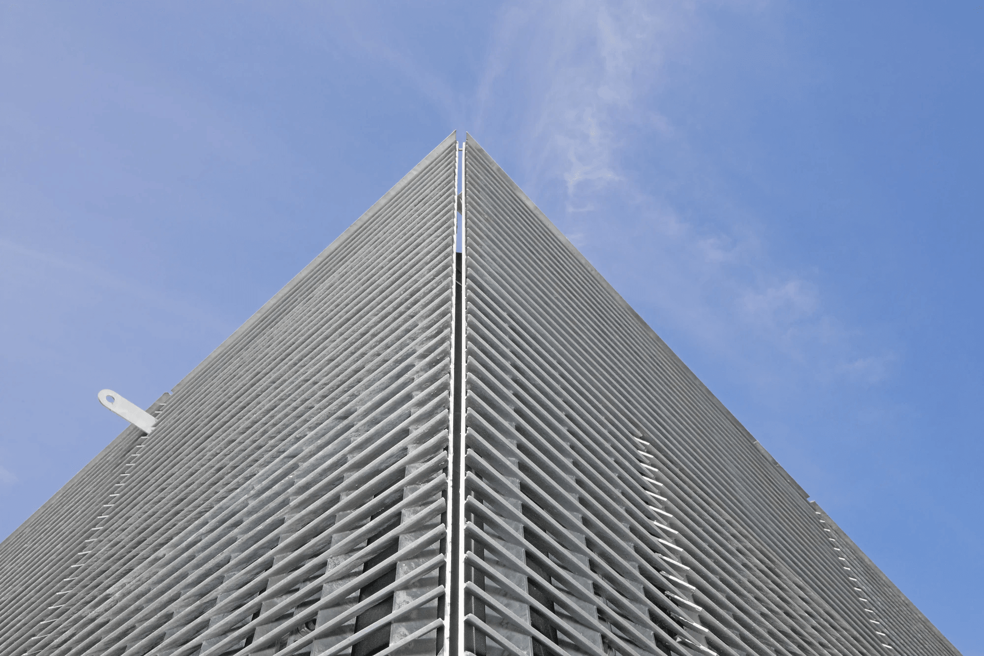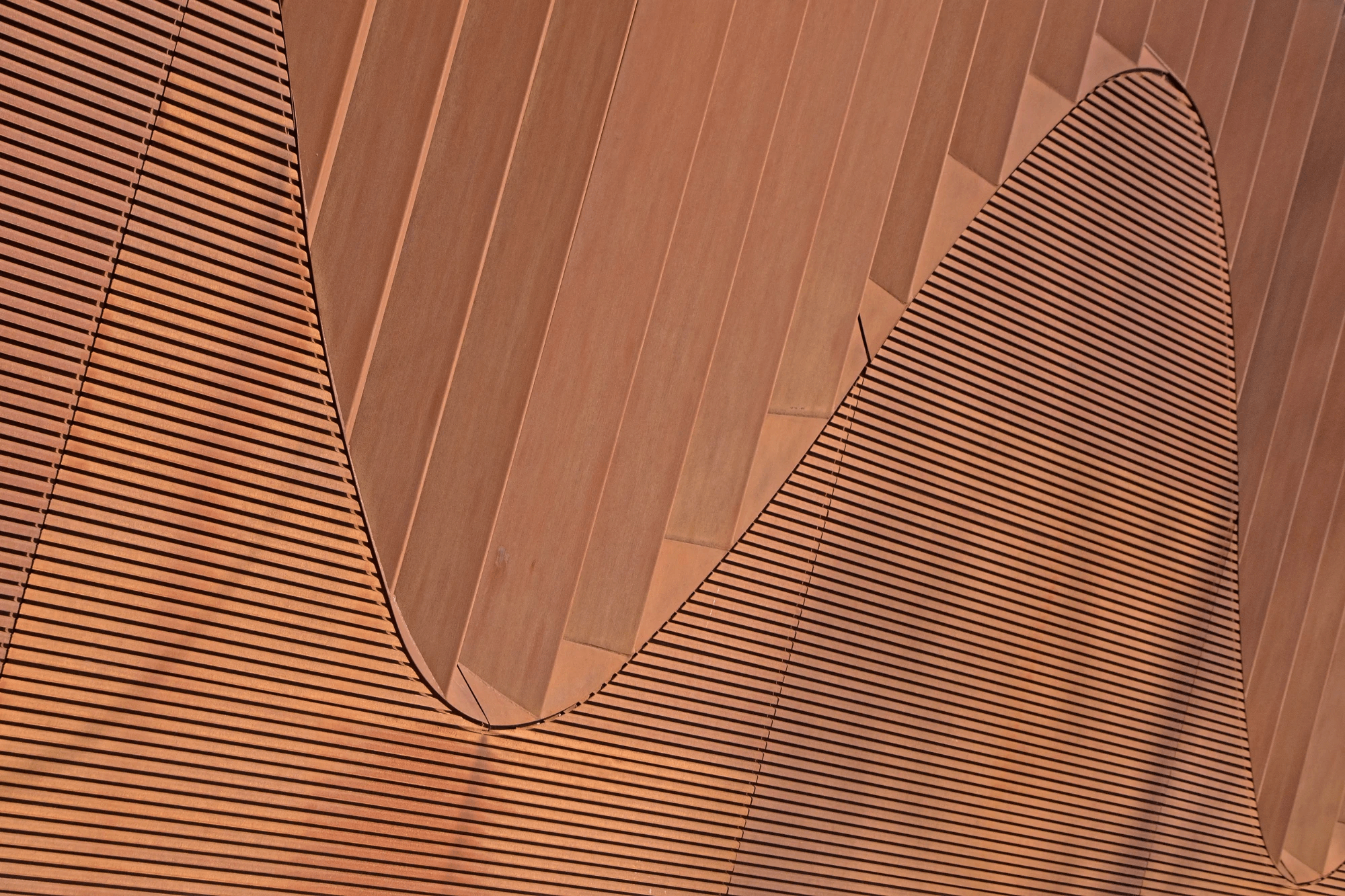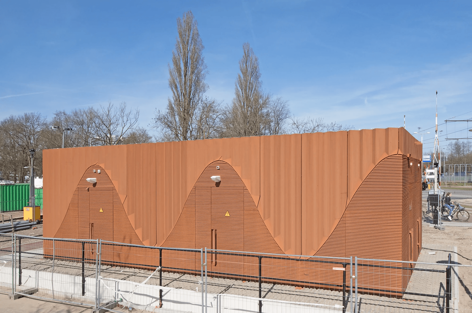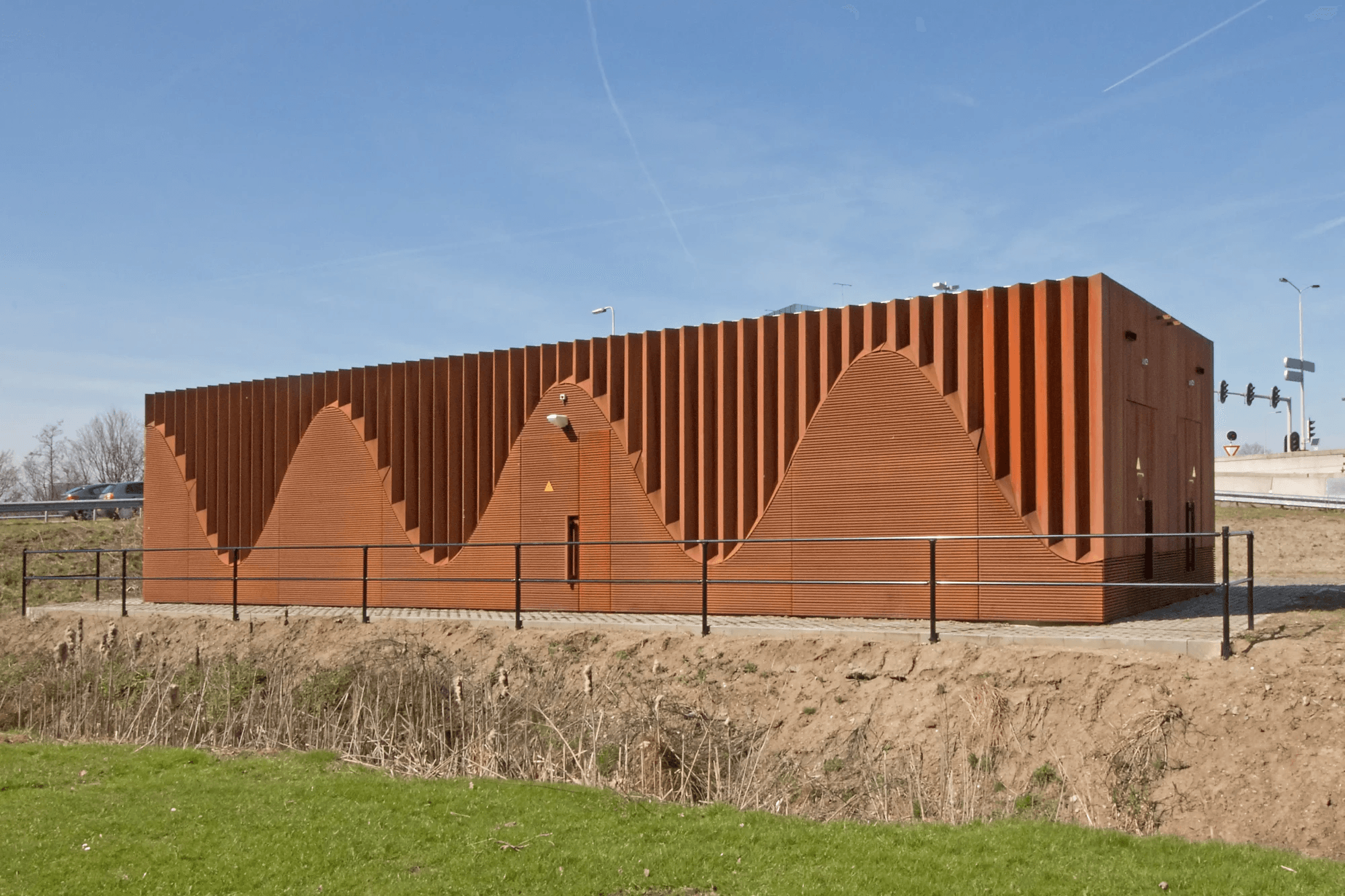 Het grafische beeld wordt bereikt door een verschil in reliëf en textuur boven en onder de lijn. De bovenkant bestaat uit asymmetrisch gevouwen Cortenstalen panelen, zodat het gebouw uit verschillende hoeken anders wordt beleefd. Voor een optimale ventilatie bestaat de gevel aan de onderzijde uit gezette roosters. Door een groot oppervlak roostergevel te maken is het dus geen probleem om tijdens het ontwerpproces of in de toekomst extra openingen te maken.