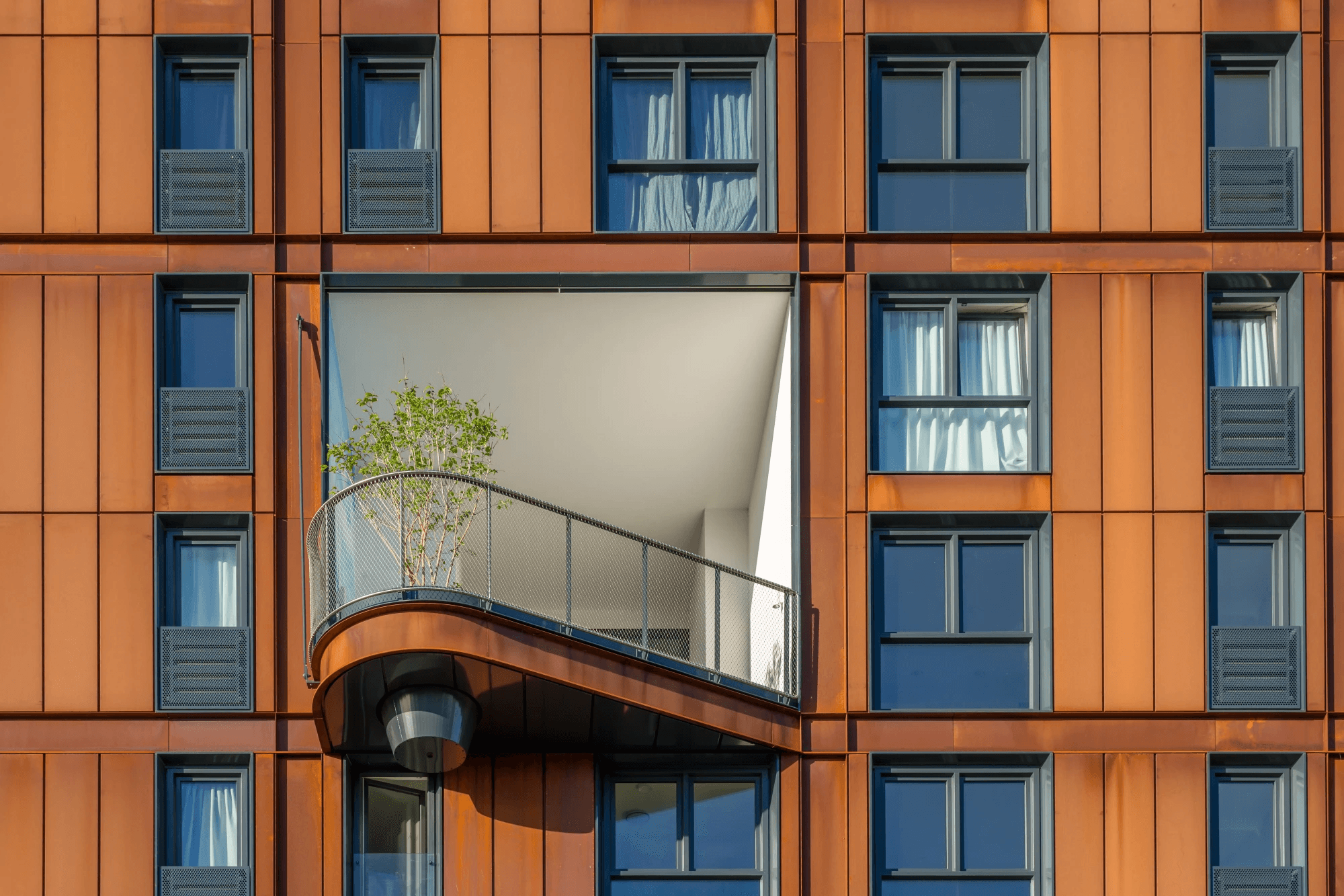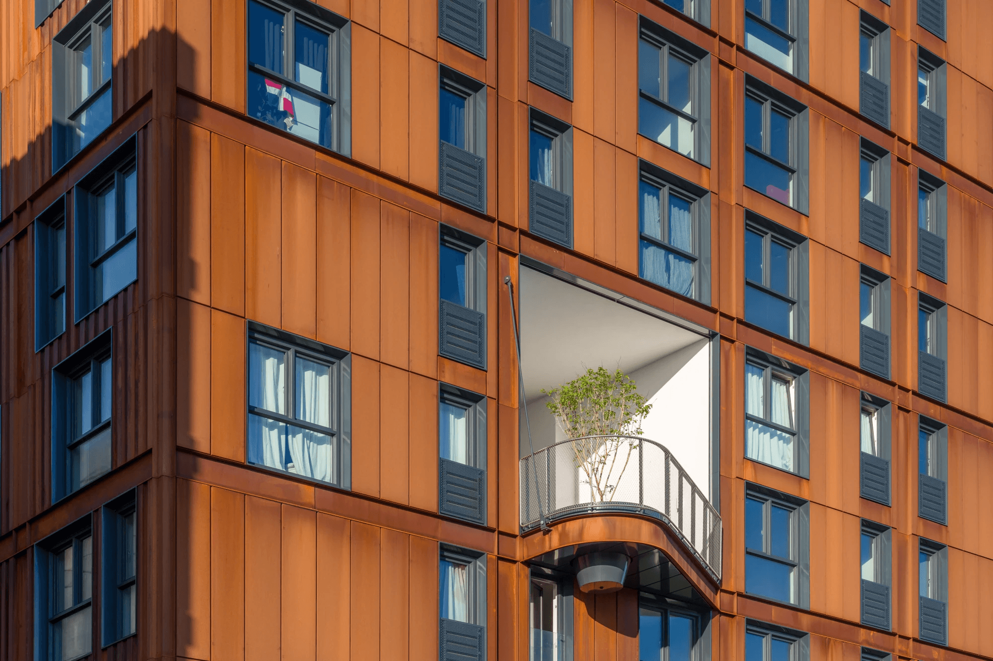 Wat is rood, roest en robuust? Juist, woontoren Kavel 6 op Oostenburgeiland in Amsterdam. De gedetailleerde Cortenstalen gevel, met zijn grote diepgelegen ramen, passen bij de industriele esthetiek van de buurt. Een mooi contrast met het omliggende groen van de beplantte daken en collectieve buitentuin.