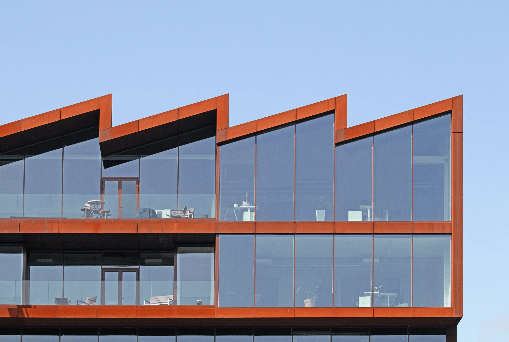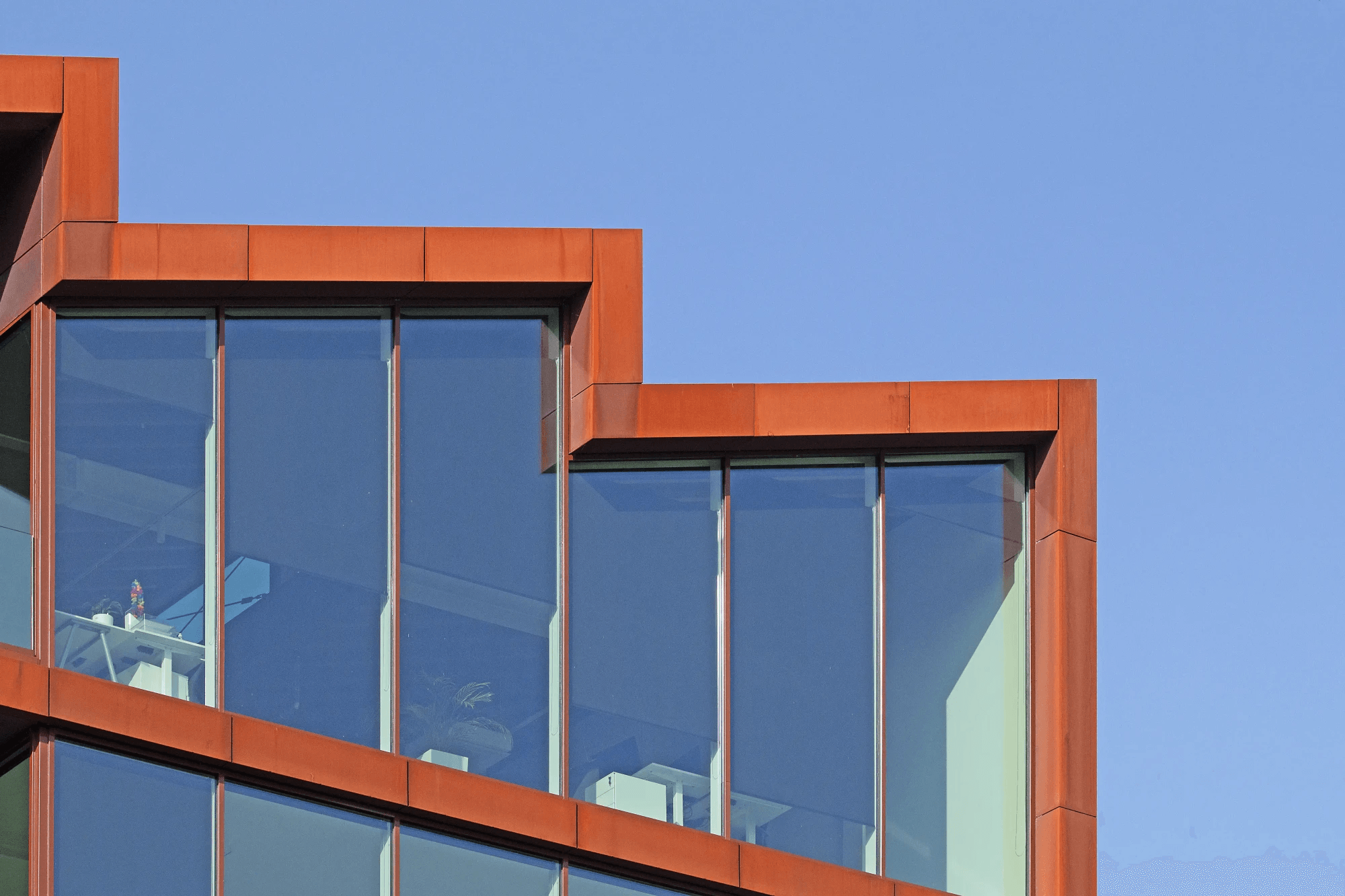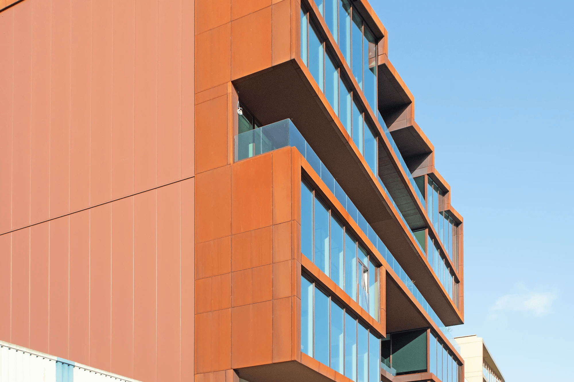 Het nieuwe kantoorpand van Dedato (Danzigerkade 2) is helemaal klaar voor de herfst. Door de cortenstalen gevelbekleding heeft het gebouw een stoere en roestige look. Hierdoor wordt het gebouw een échte blikvanger. Danzigerkade wordt een leuke, kleurrijke straat. Naast dit cortenstalen eyecatcher staat namelijk ook een goudkleurig pand met aluminium gevelbekleding, ook gerealiseerd door VPT.