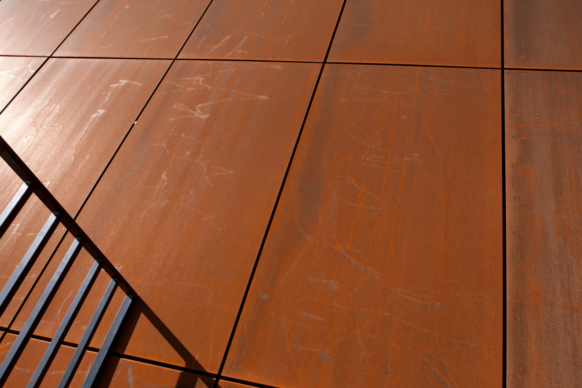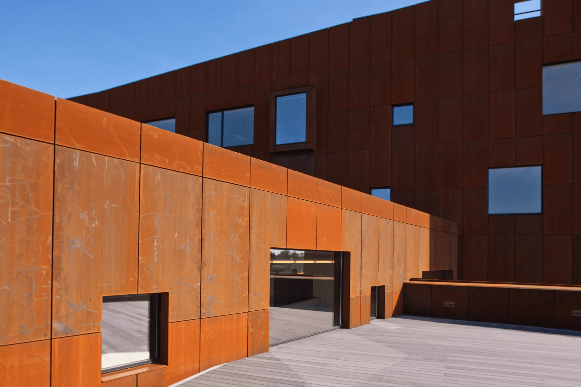 Het markante gebouw met Cortenstaal bekleding geeft een sterke, ietwat robuuste uitstraling aan de ruime Campus Vesta. In een tweede gebouw vinden schietoefeningen plaats: 12 banen en praktijklokalen. Ook hiervoor leverde VPT aluminium bekleding.