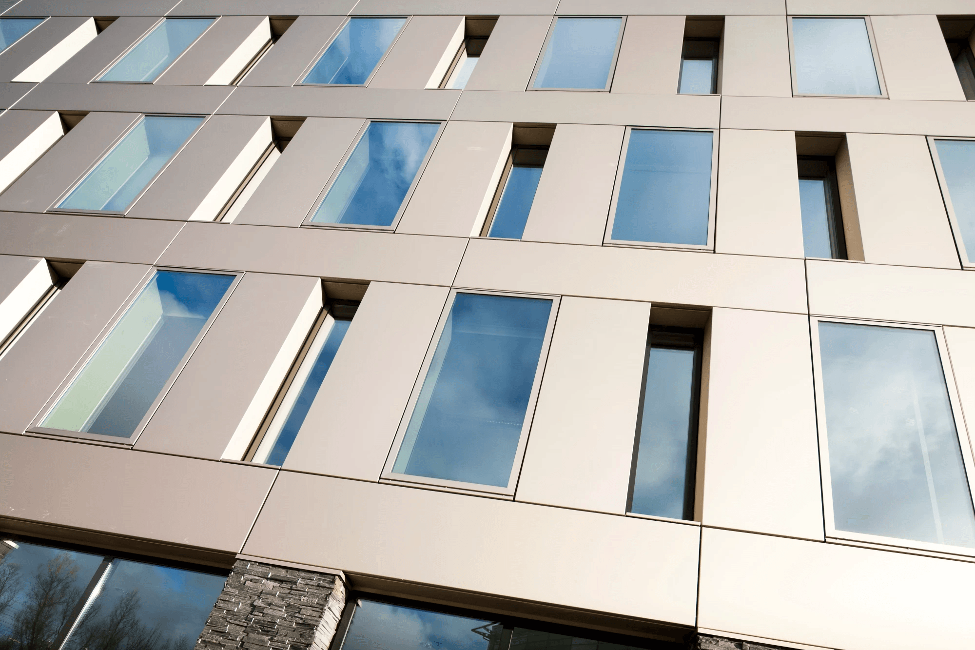 VPT Versteeg tekende, produceerde en monteerde de aluminium gevelschil. Een bekleding die wordt gekenmerkt door een combinatie van staande en liggende panelen. Bij een geanodiseerde plaat is de wals-richting en de montage richting van groot belang om goed af te stemmen. Bij dit werk is dit geen uitzondering, want de richting zorgt voor een andere reflectie van het licht. Het cassette systeem is uitgevoerd met een geïntegreerde aansluiting naar de kozijnen. Deze zijn afwisselen vlak- en verdiept geplaatst ten opzichte van het paneelvlak.