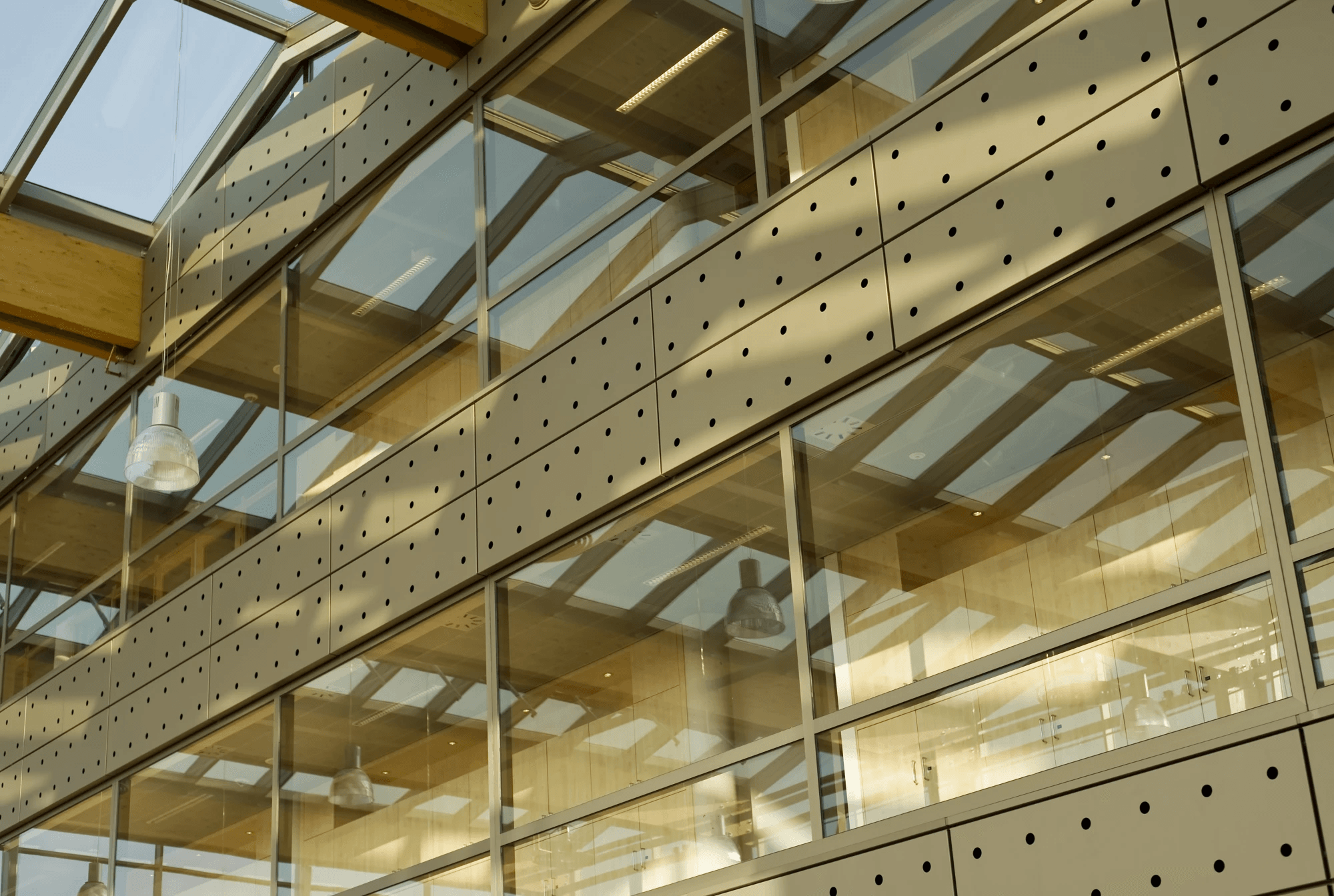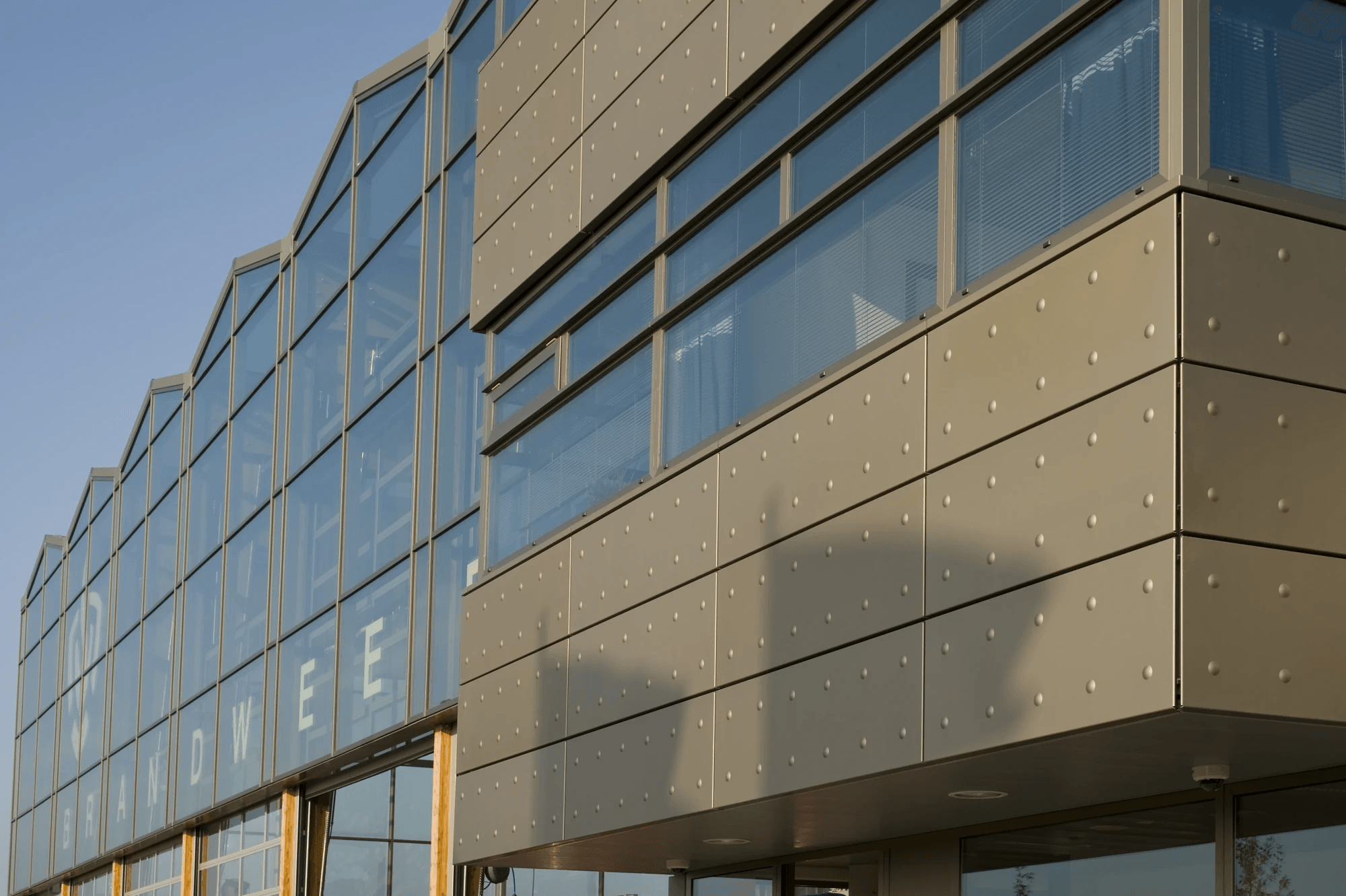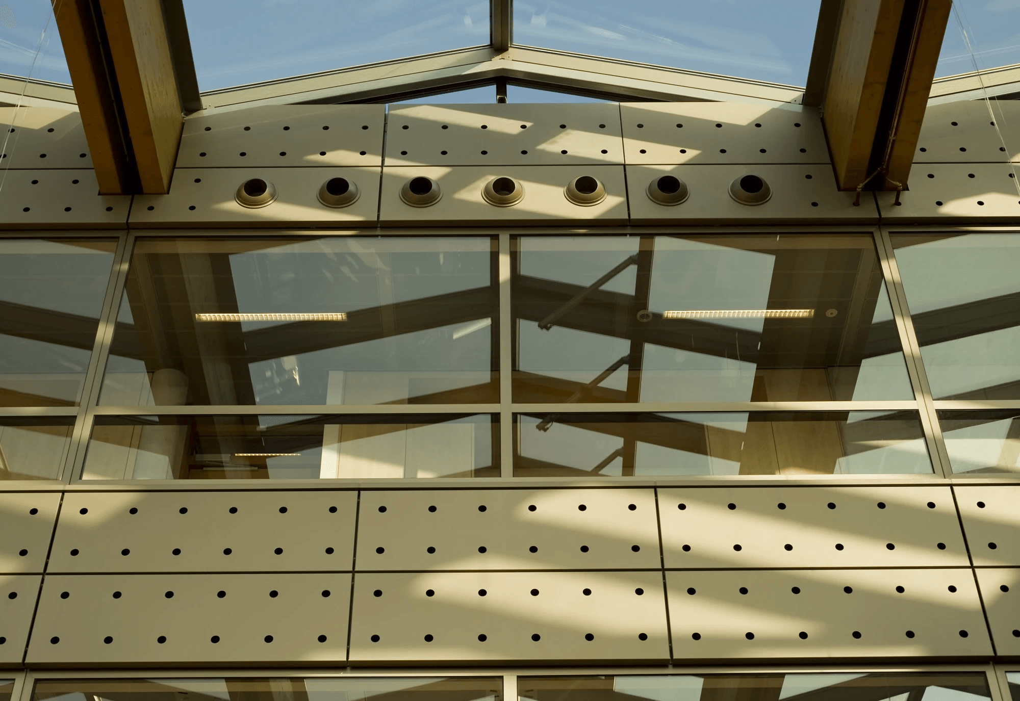 De gevelbekleding is aan de buitenzijde voorzien van een met reliëfdruk. De noppen reflecteren het licht, waardoor er een extra dimensie aan de beleving wordt toegevoegd. De binnengevels zijn met een perforatie voorzien. De combinatie van perforeren en wandisolatie resulteert in een akoestische wand opbouw.