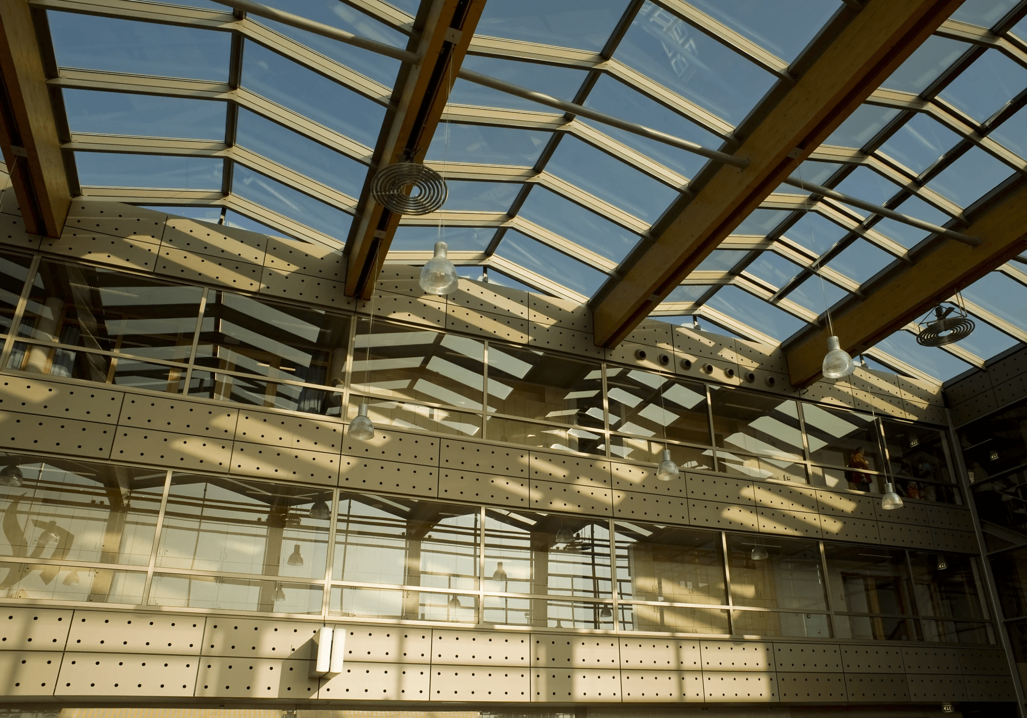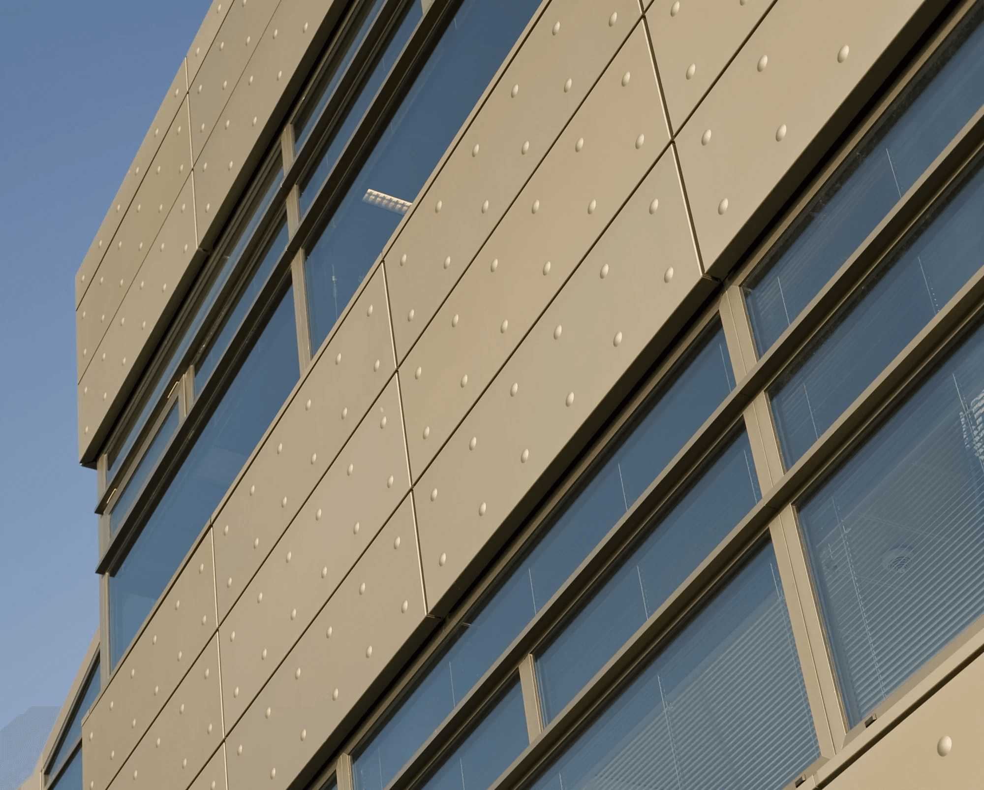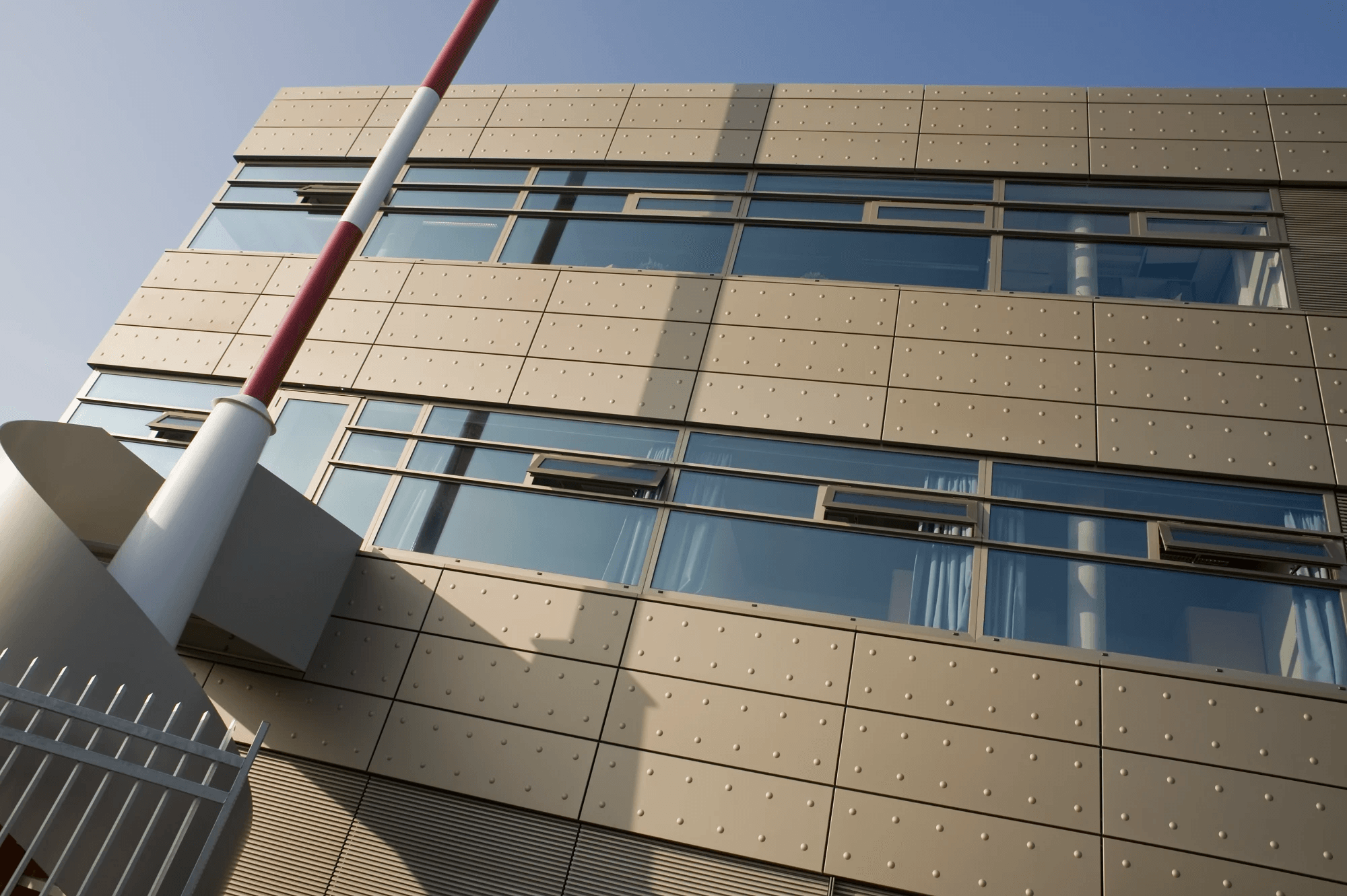 De gevelbekleding is aan de buitenzijde voorzien van een met reliëfdruk. De noppen reflecteren het licht, waardoor er een extra dimensie aan de beleving wordt toegevoegd. De binnengevels zijn met een perforatie voorzien. De combinatie van perforeren en wandisolatie resulteert in een akoestische wand opbouw.