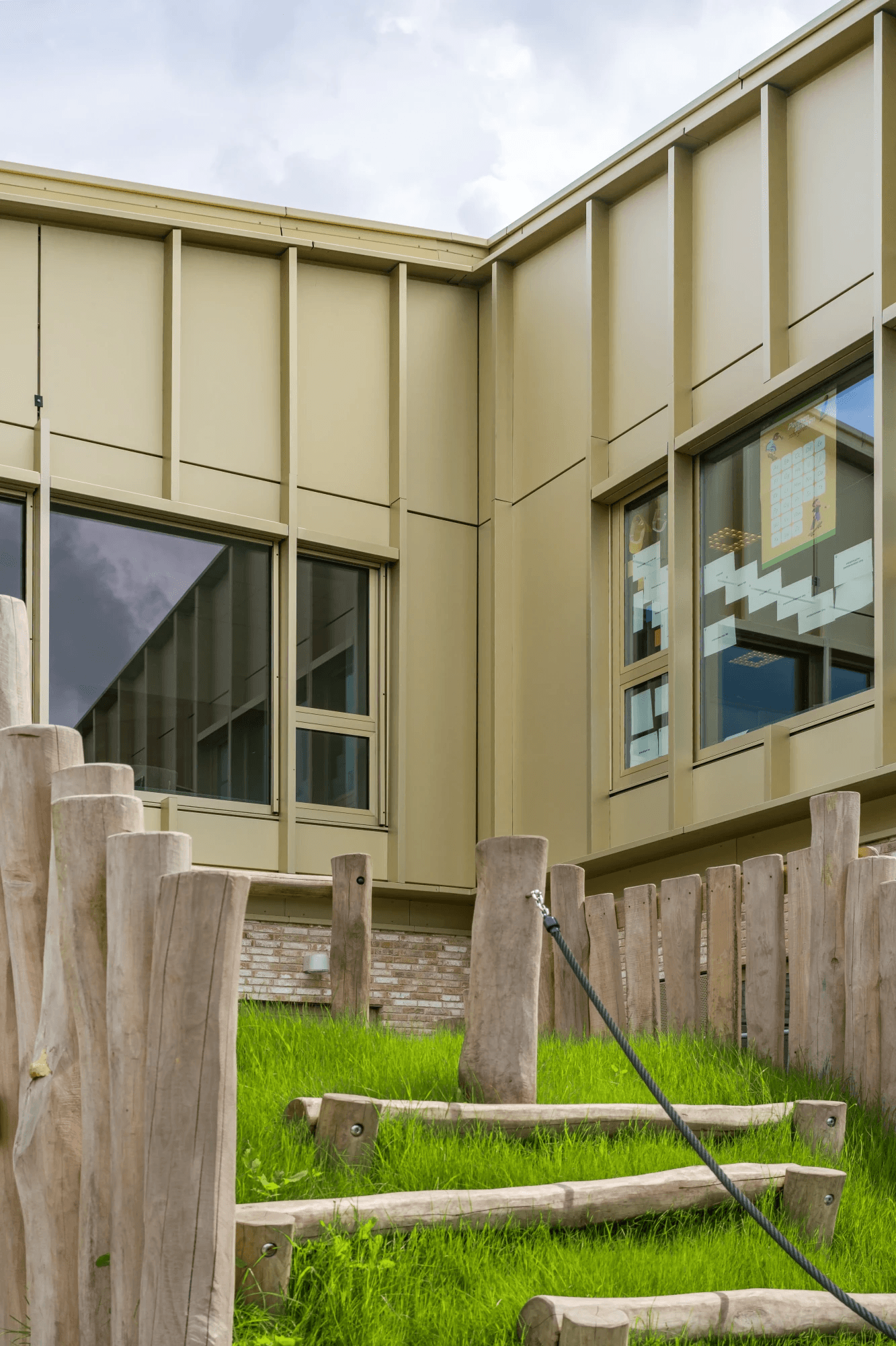 De ware eyecatcher van IKC Kroevendonk is zonder twijfel de goudkleurige geanodiseerde aluminium bekleding. Deze bijzondere afwerking geeft het gebouw een luxueuze en tijdloze uitstraling, die direct in het oog springt. Het anodiseren van het aluminium zorgt niet alleen voor de schitterende goudkleur, maar biedt ook extra bescherming tegen weersinvloeden, waardoor de gevel zijn glans behoudt gedurende vele jaren.