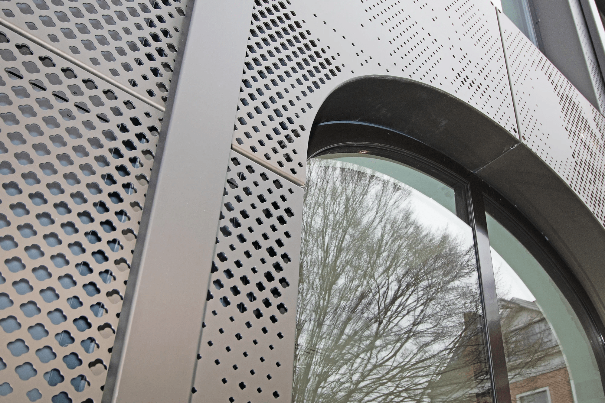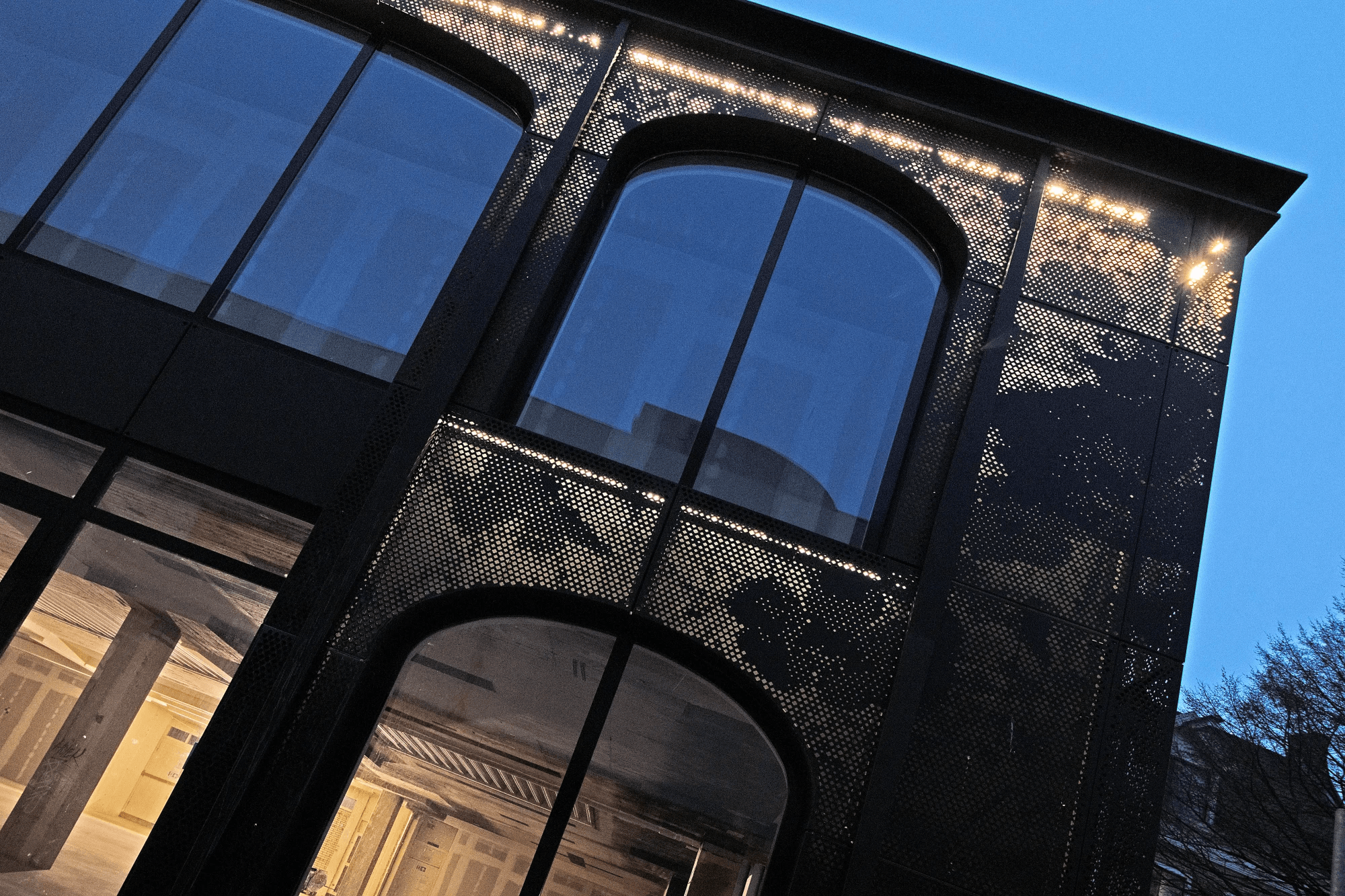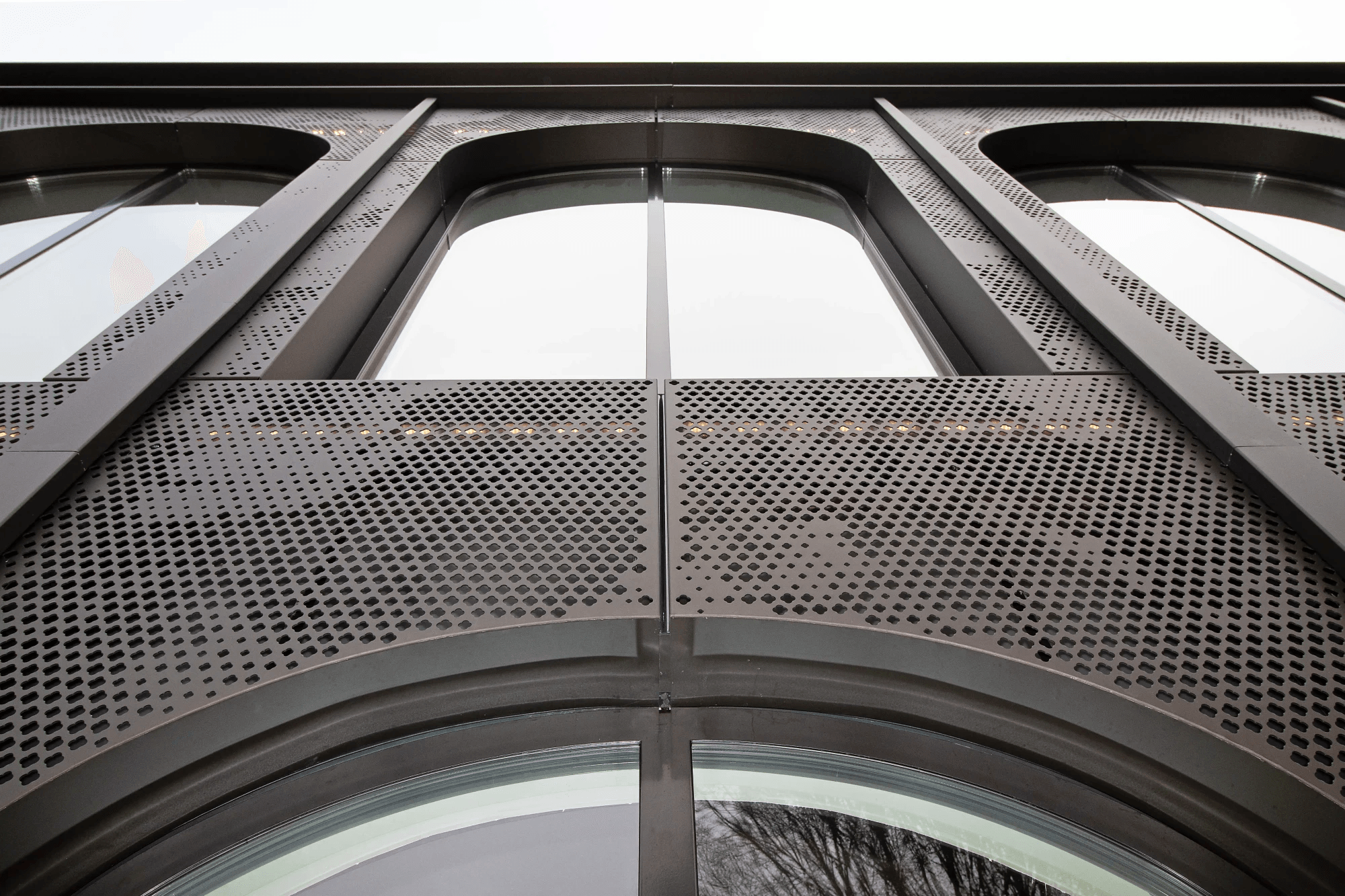 Gevelbekleding in aluminium voorzien van perforatiepatroon en LED-verlichting