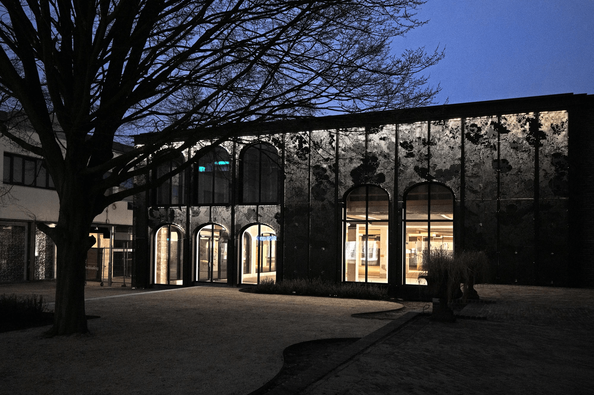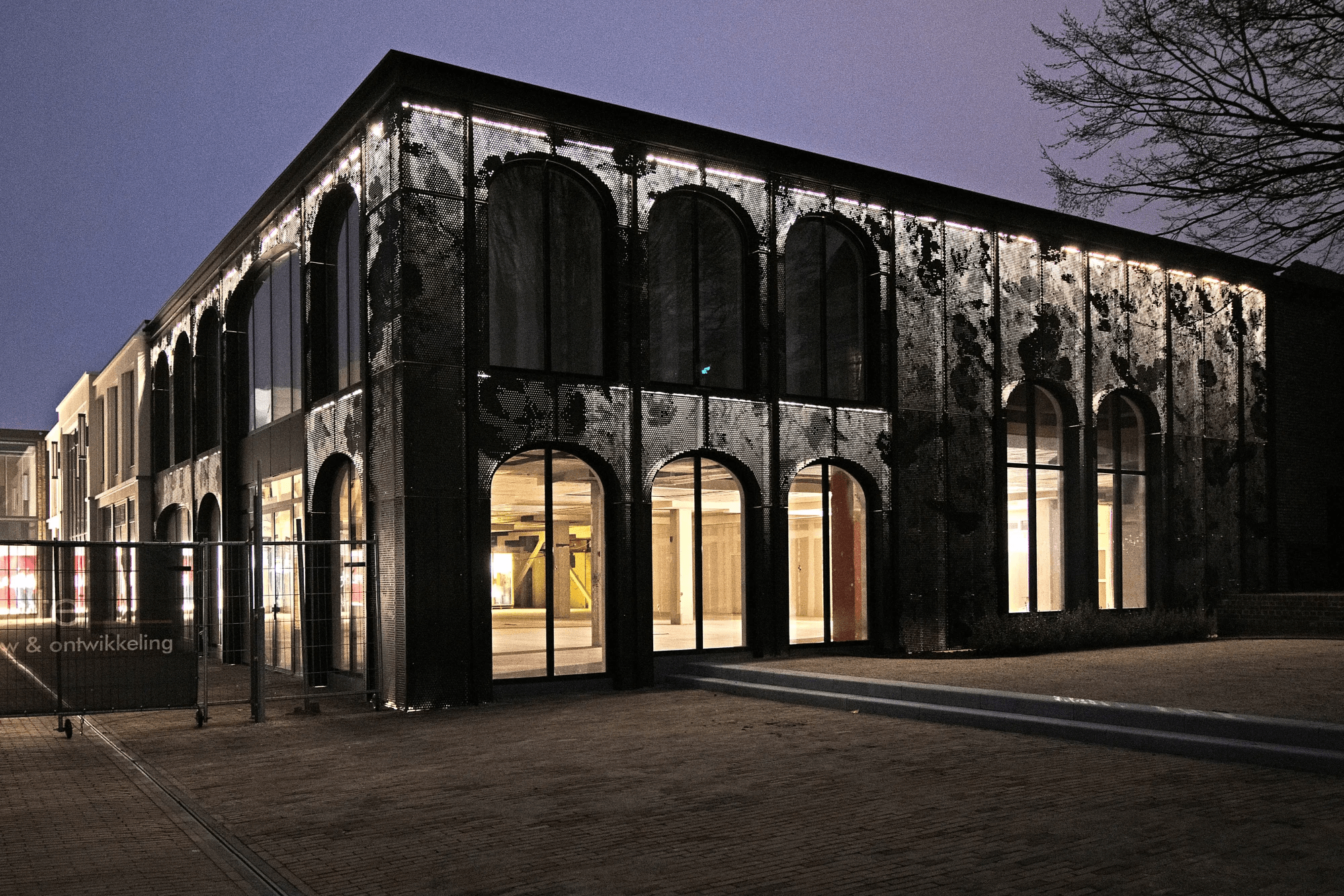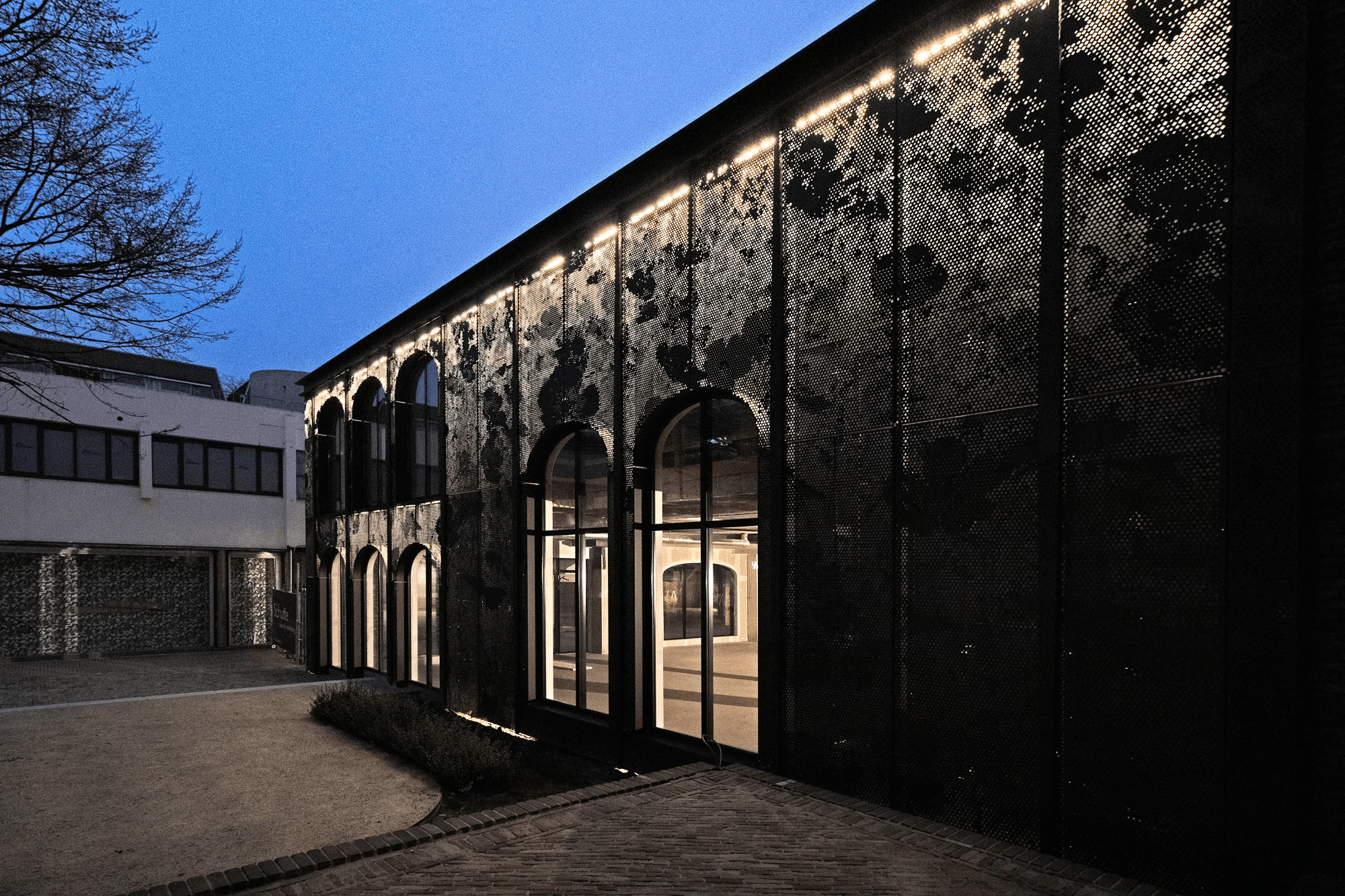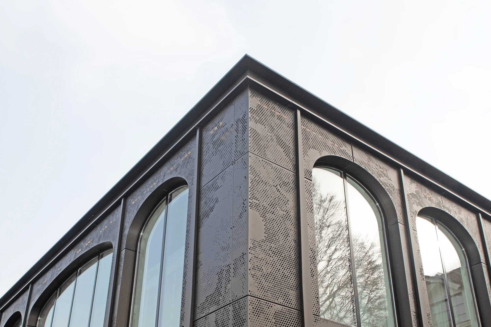 Gevelbekleding in aluminium voorzien van perforatiepatroon en LED-verlichting