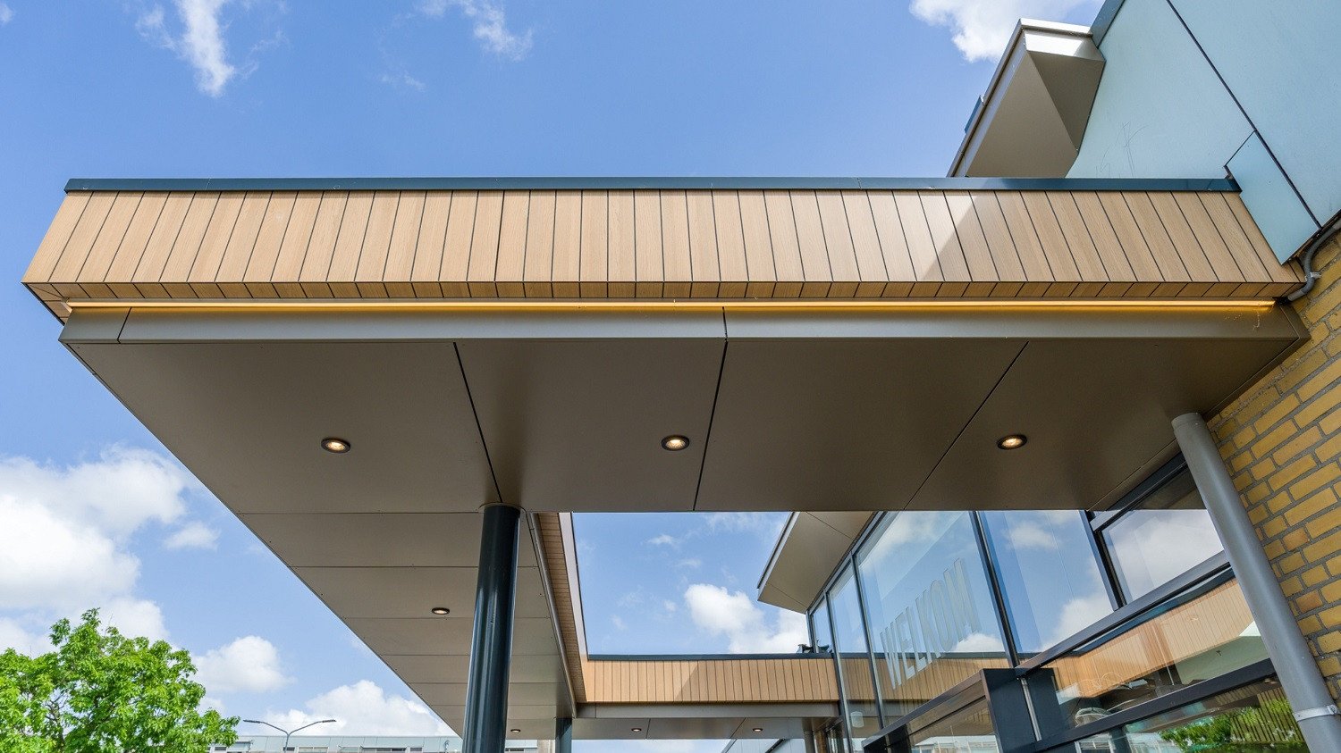 De gevelpanelen zijn vervaardigd uit geponst aluminium en voorzien van een poedercoating in een stijlvolle bronzen kleur. Deze afwerking draagt niet alleen bij aan een modern uiterlijk, maar zorgt ook voor een lange levensduur en minimale onderhoudsbehoefte.