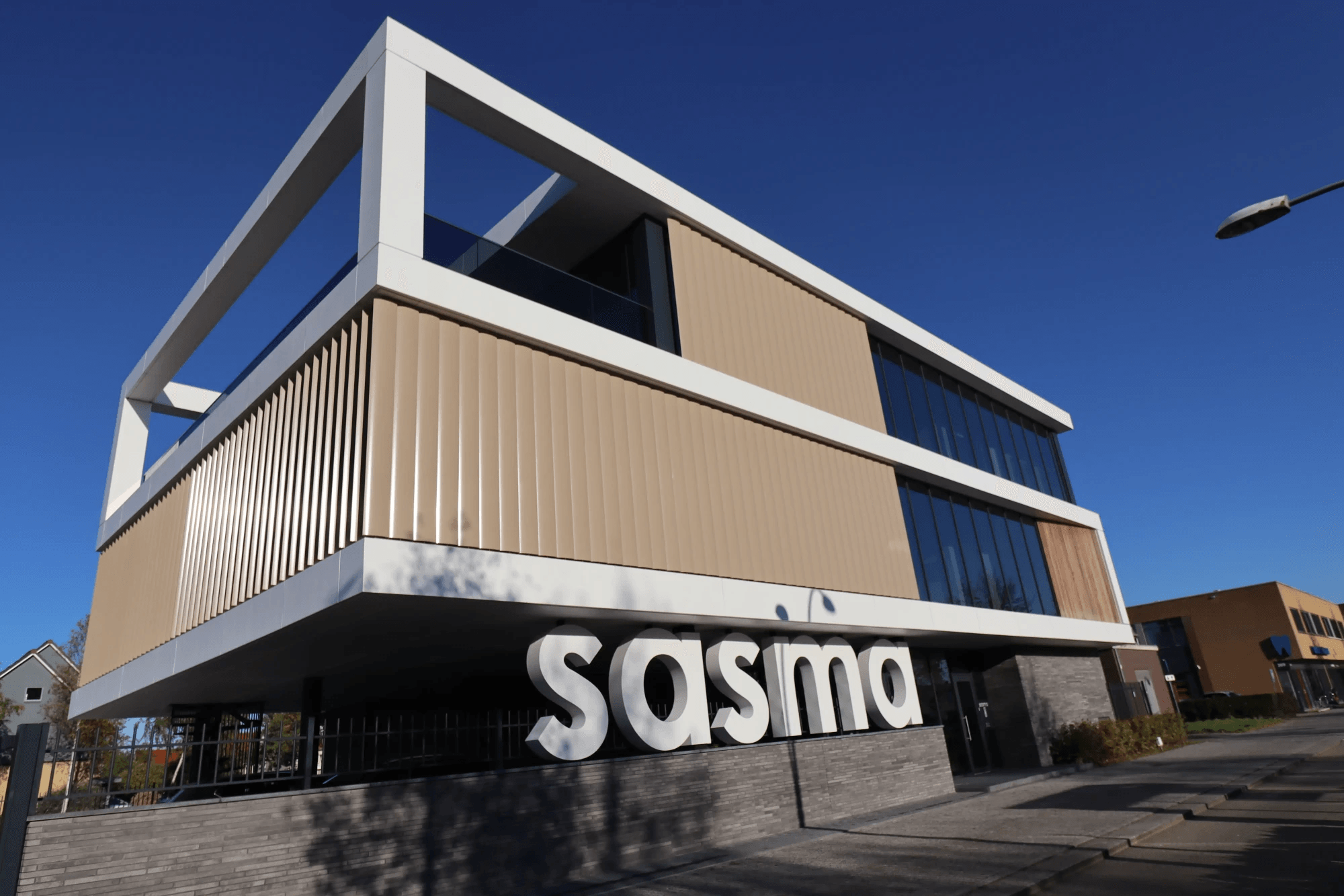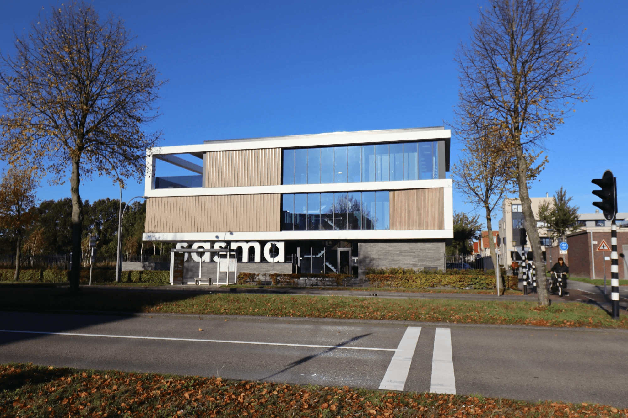 Het nieuwe kantoorpand van Sasma oogt rust, licht en ruimtelijk wat goed past in de omgeving.