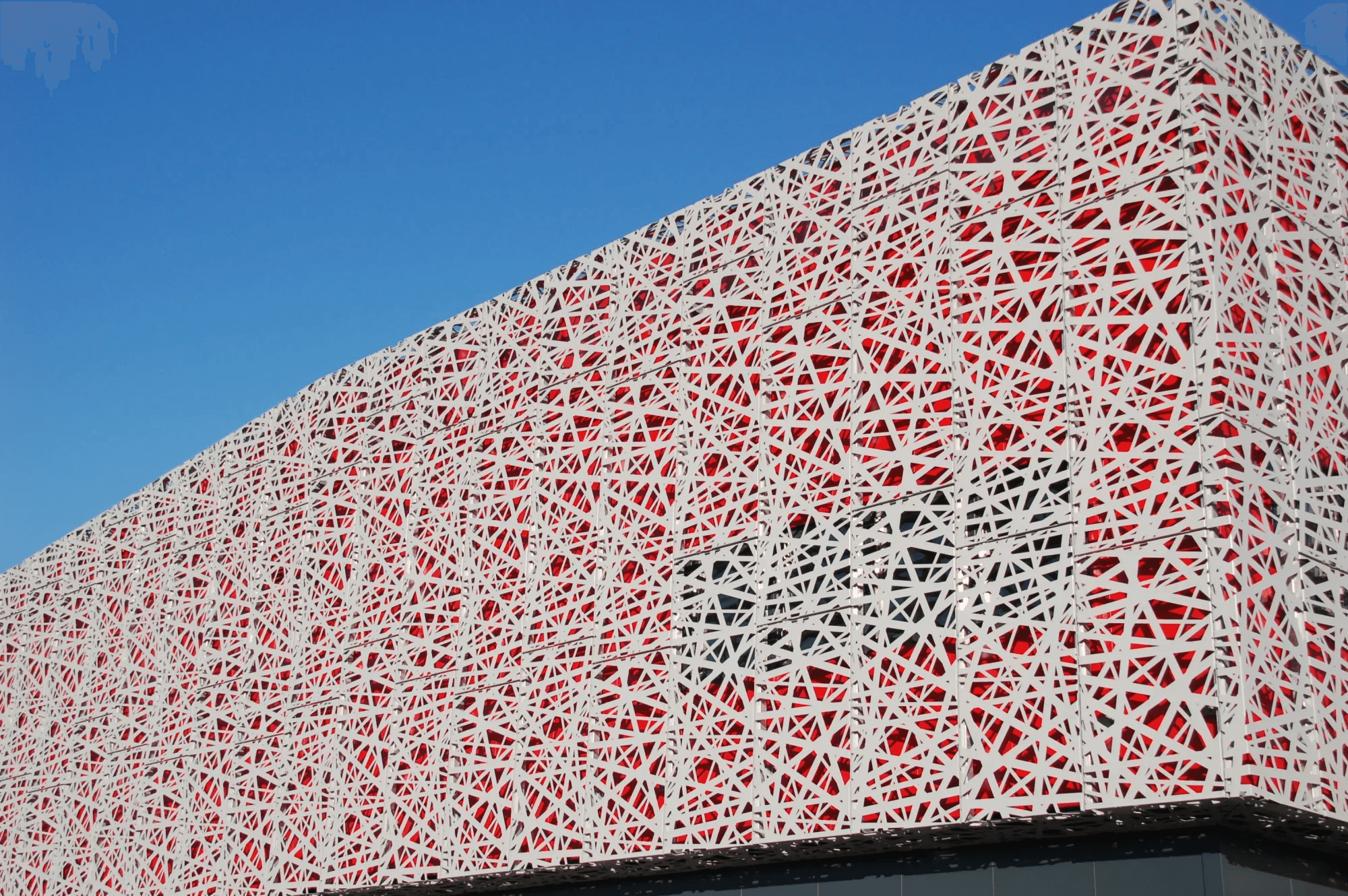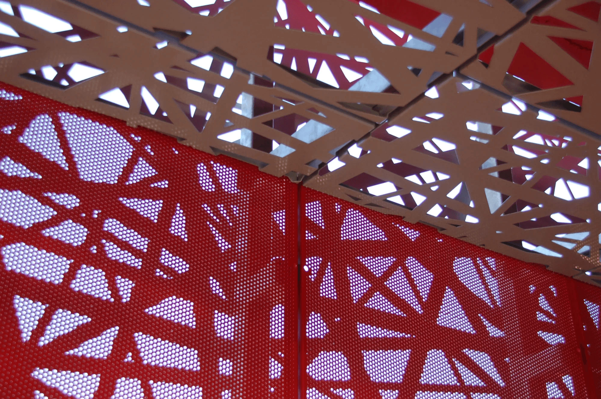 De gevelopbouw geeft het gebouw een mate van afscherming en transparantie. Het gesneden patroon is consequent doorgevoerd in alle elementen, van gevelschil tot plafonds en gevelbanden. Naast de zilvergrijze panelen langs de buitenzijde vormt een rode bekleding de binnenafwerking. Op diverse locaties zijn aluminium geperforeerde panelen toegepast.