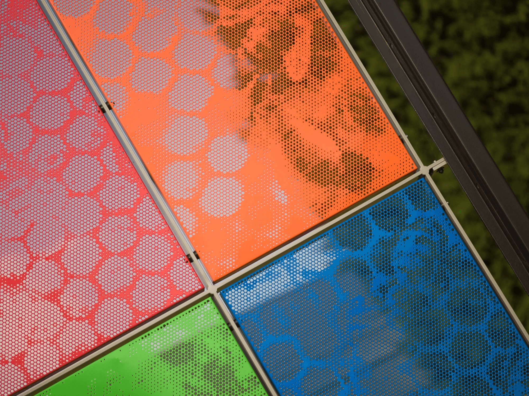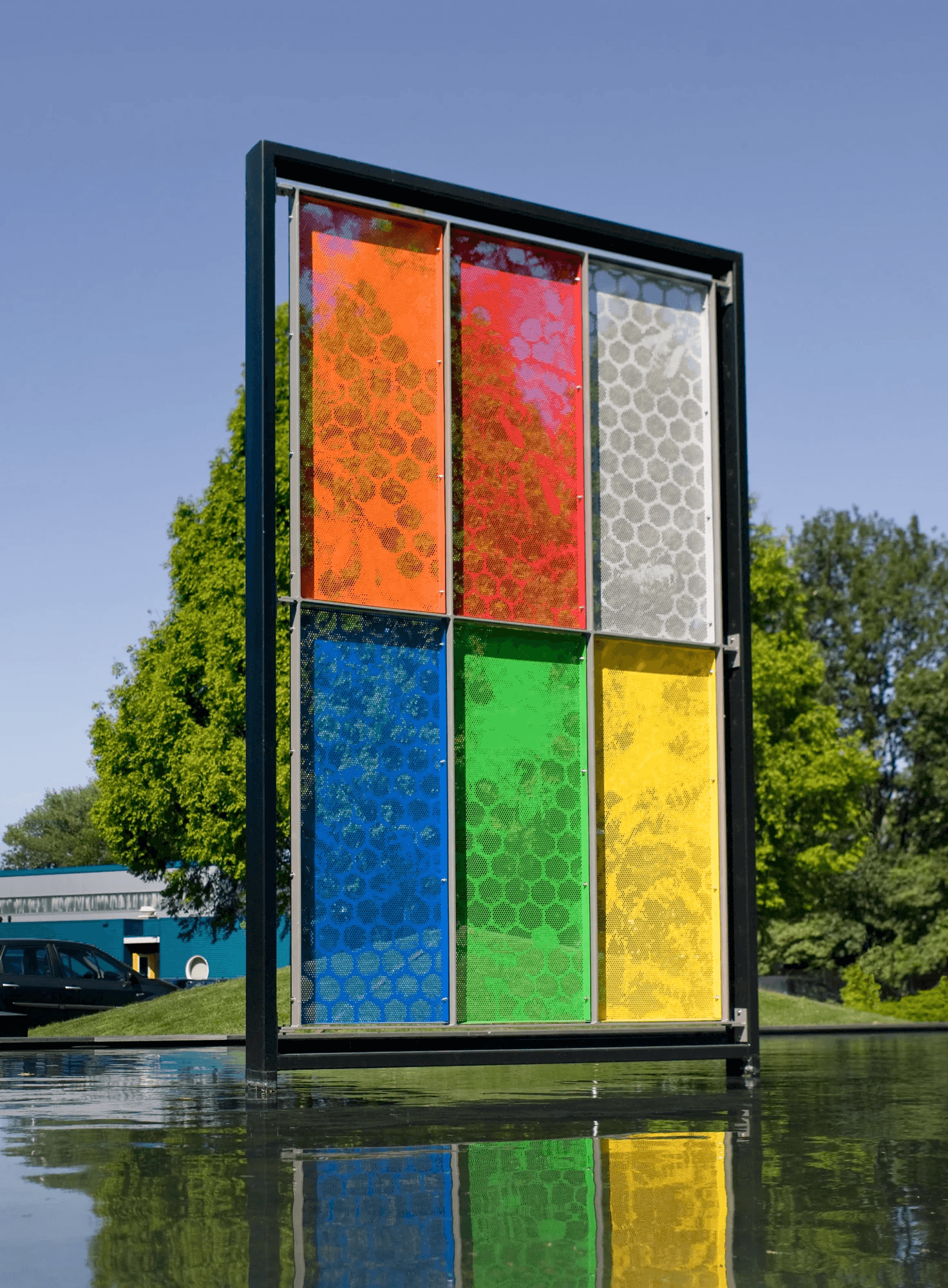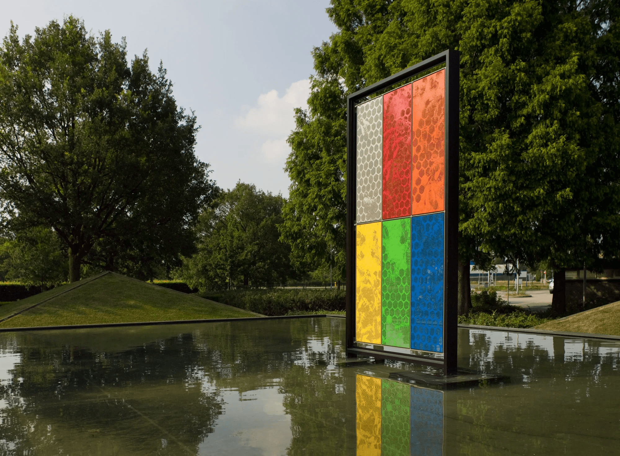VPT verzorgde de Art-Punch panelen, het frame en de montage. Een leuke uitdaging als je bedenkt dat het kunstwerk in het midden van een vijver geplaatst is.