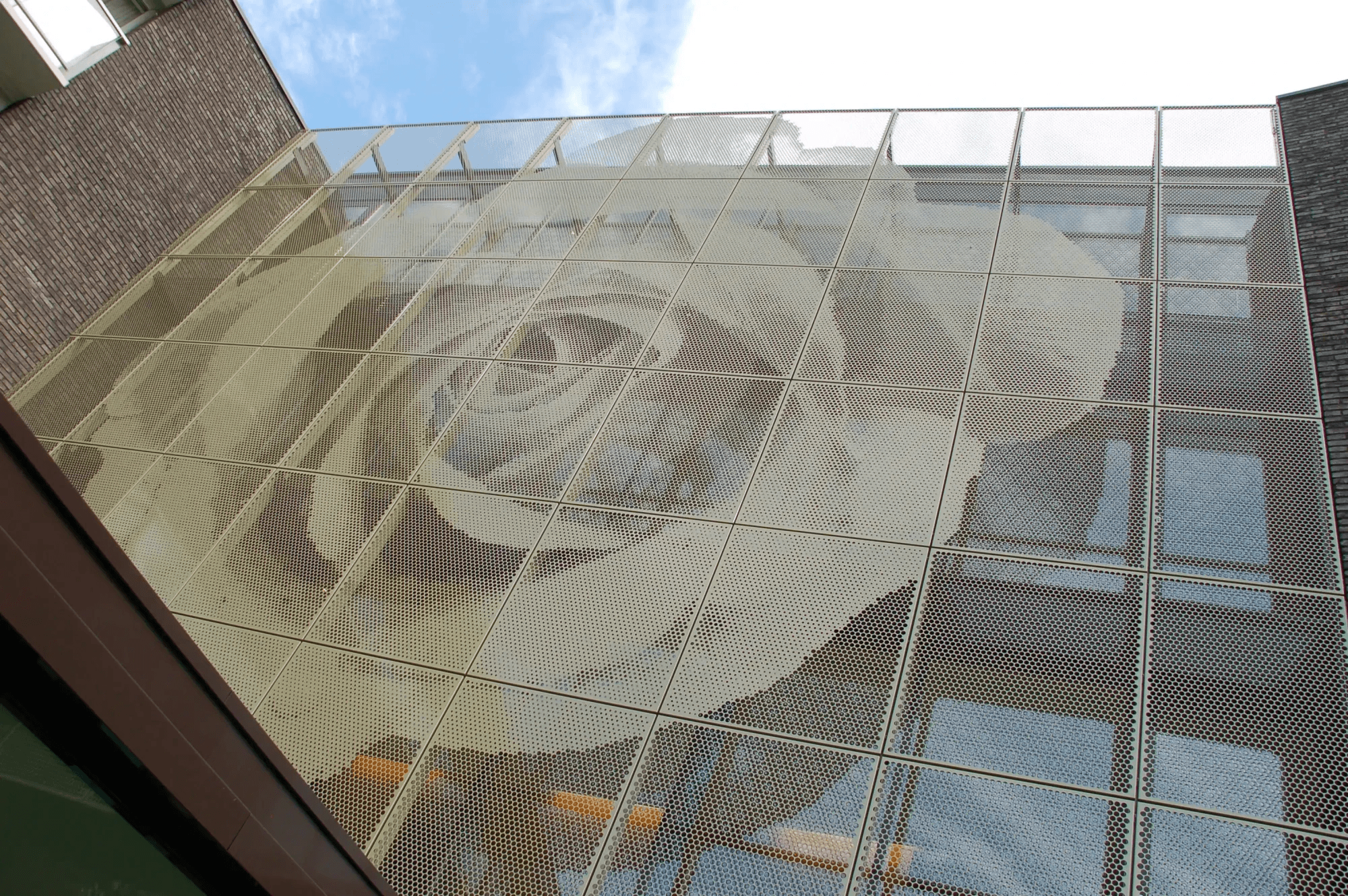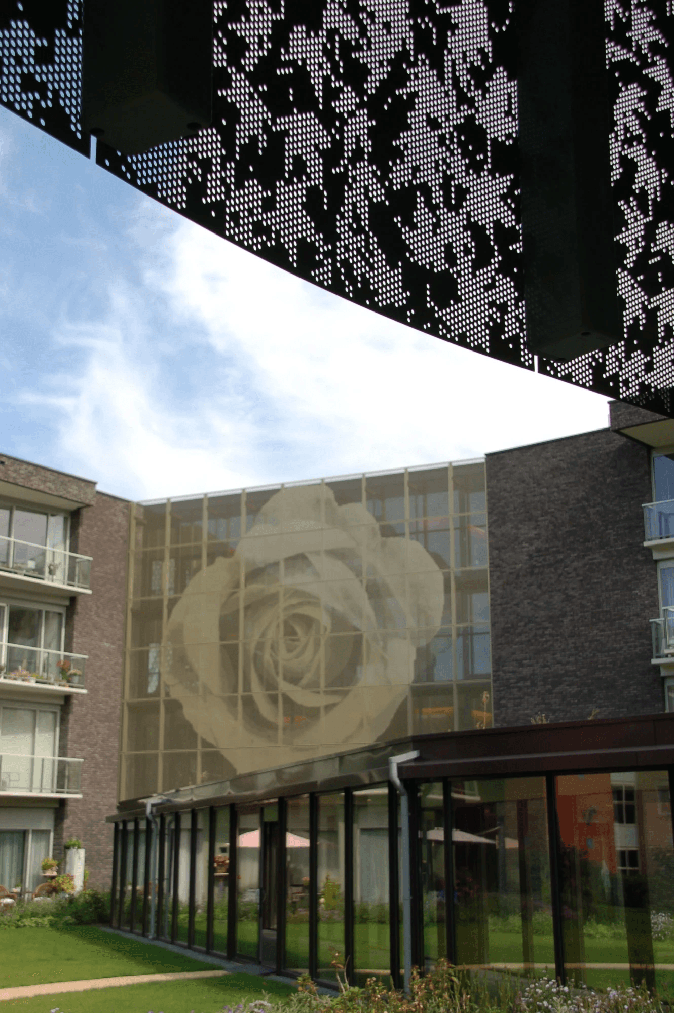 Roos- en bladmotief in aluminium geperforeerde gevel
