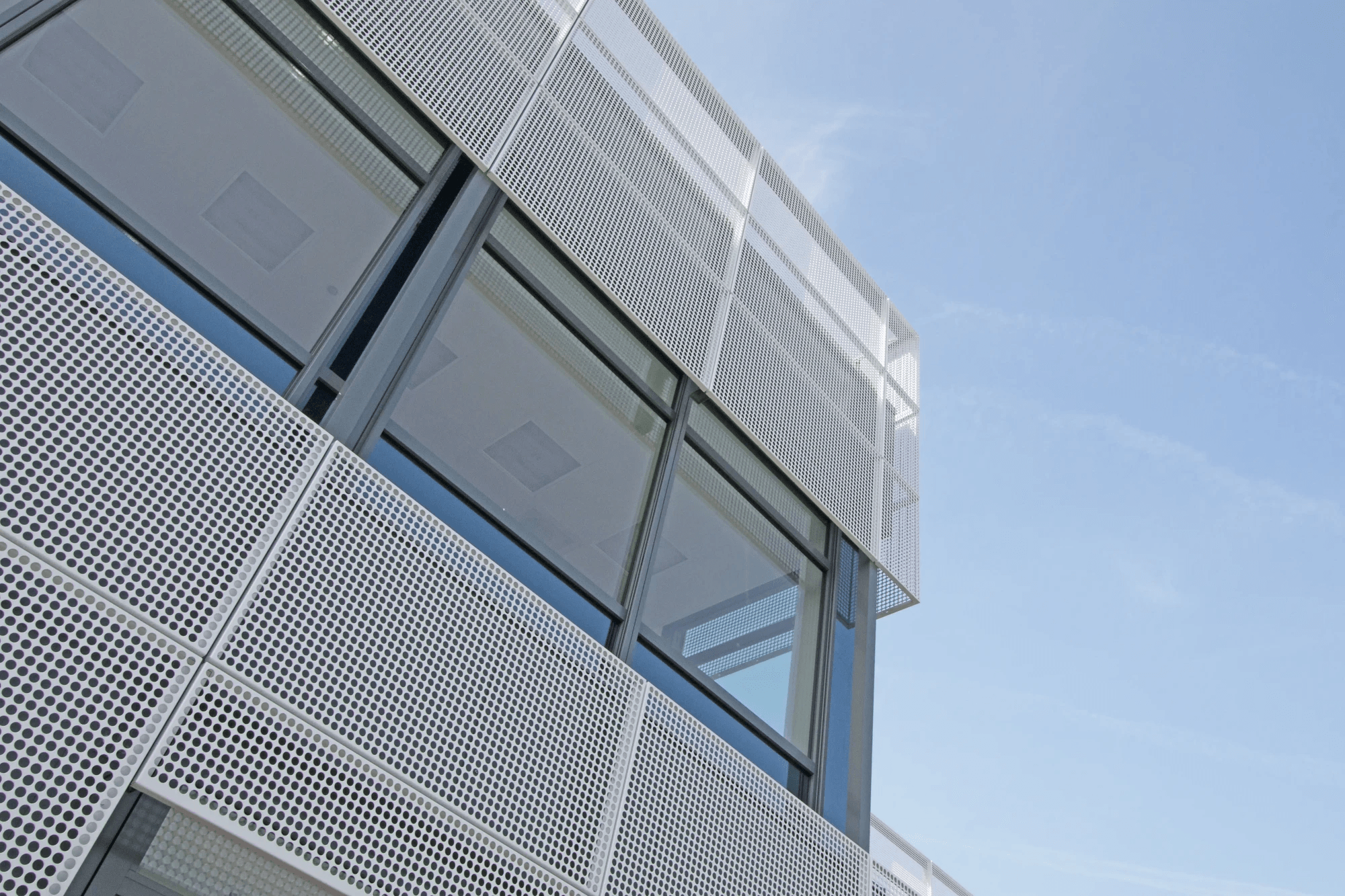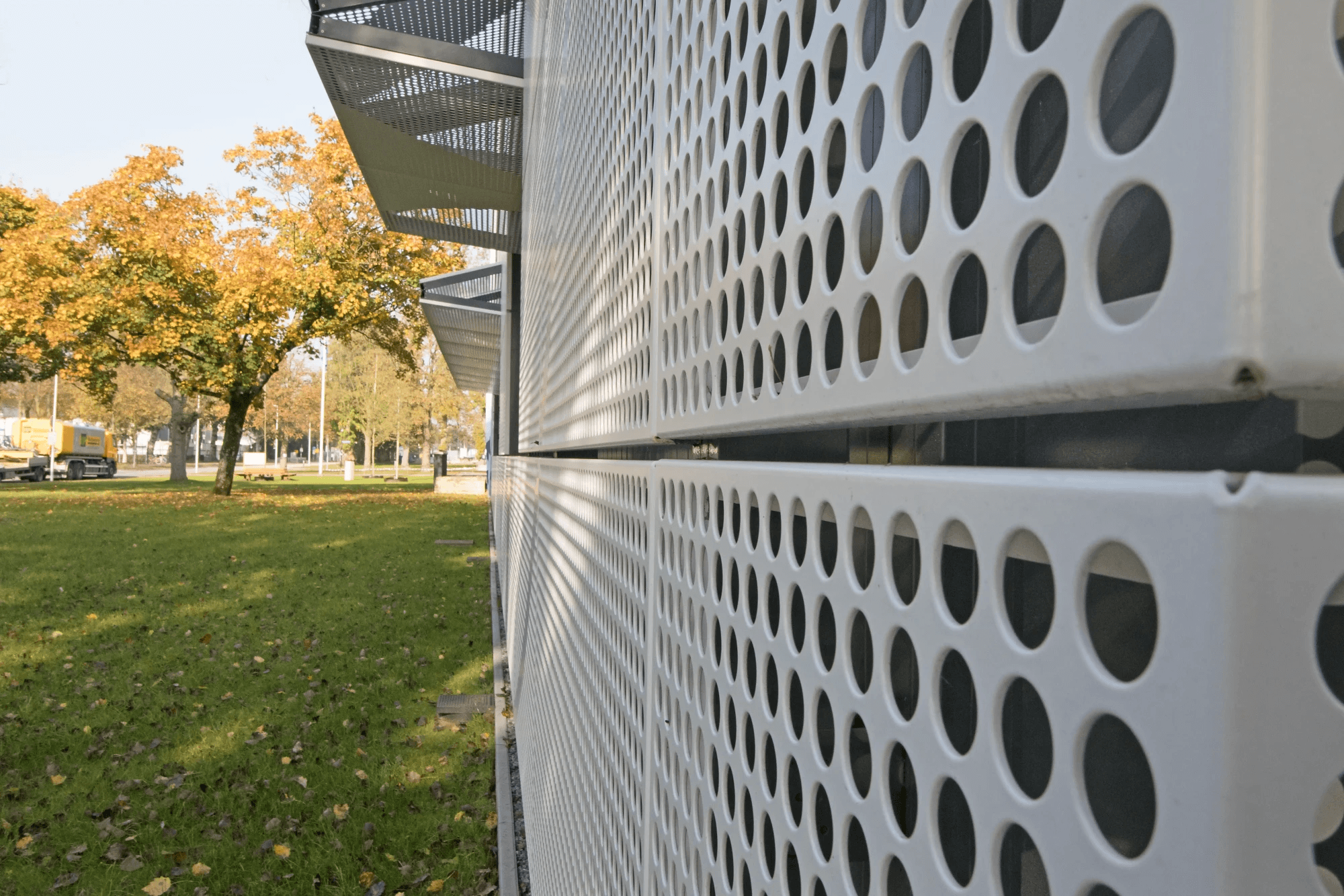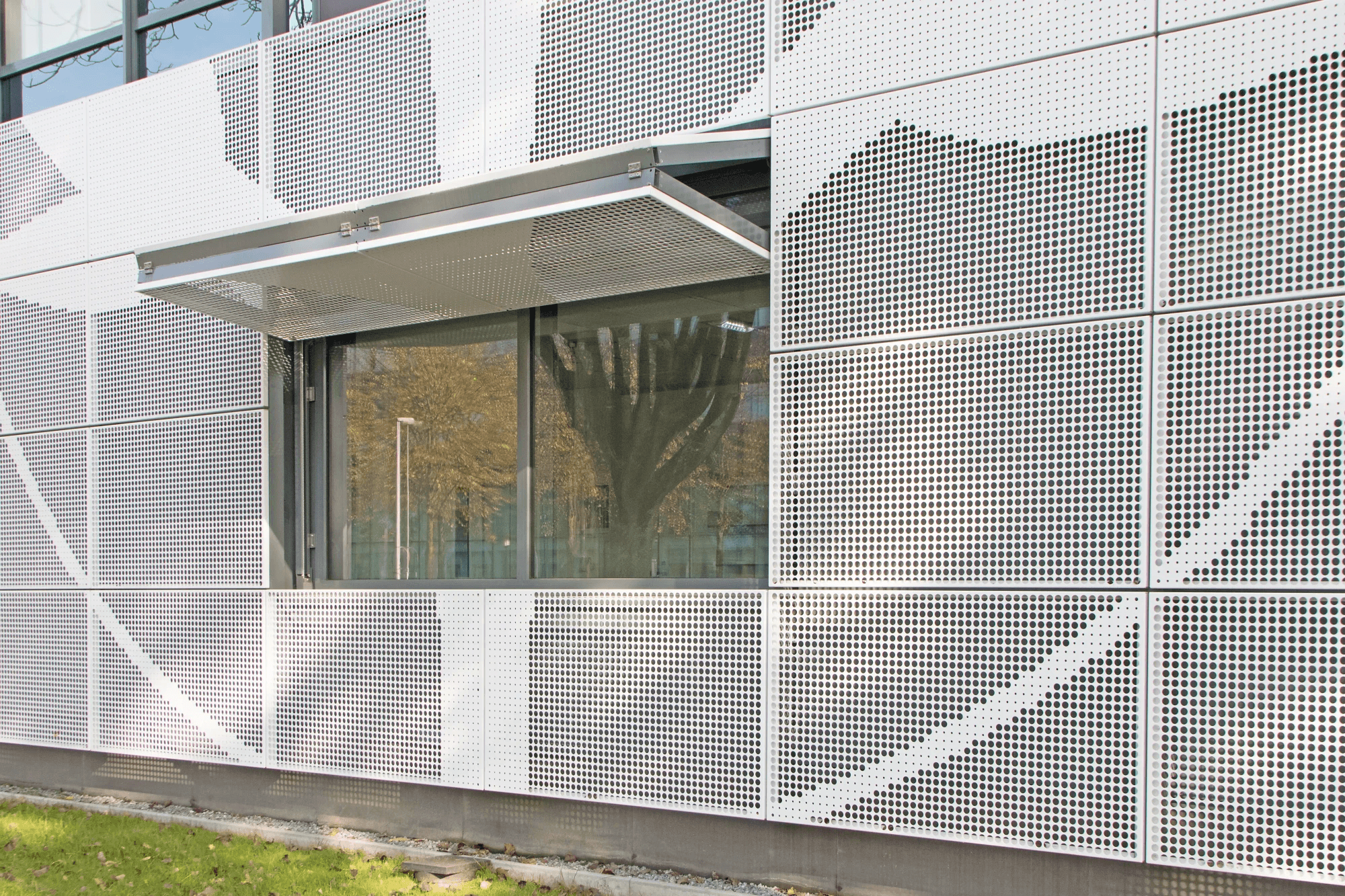 VPT heeft de complete gevelschil gerealiseerd waarbij een systeem van sandwichpanelen de isolerende laag vormen. De geperforeerde gevelbekleding vormt een integraal systeem met de sandwichbekleding. De gevel is voorzien van een speciaal perforatiepatroon, waarbij de letters en het logo uitgevoerd zijn in een afwijkend patroon. De geperforeerde gevel vormt een losse schil om het gebouw die gelaagdheid geeft aan het ontwerp. De geperforeerde panelen dragen tevens bij aan de zonwering voor de ramen.