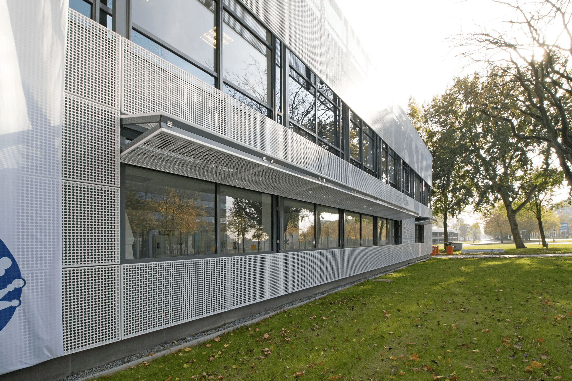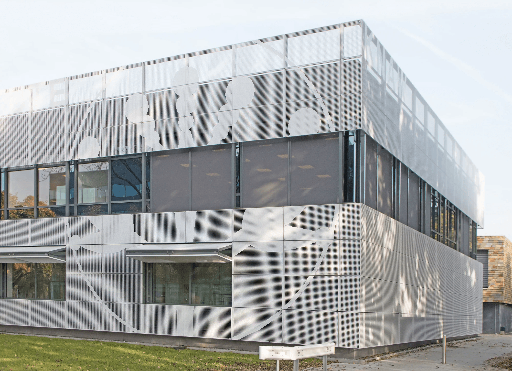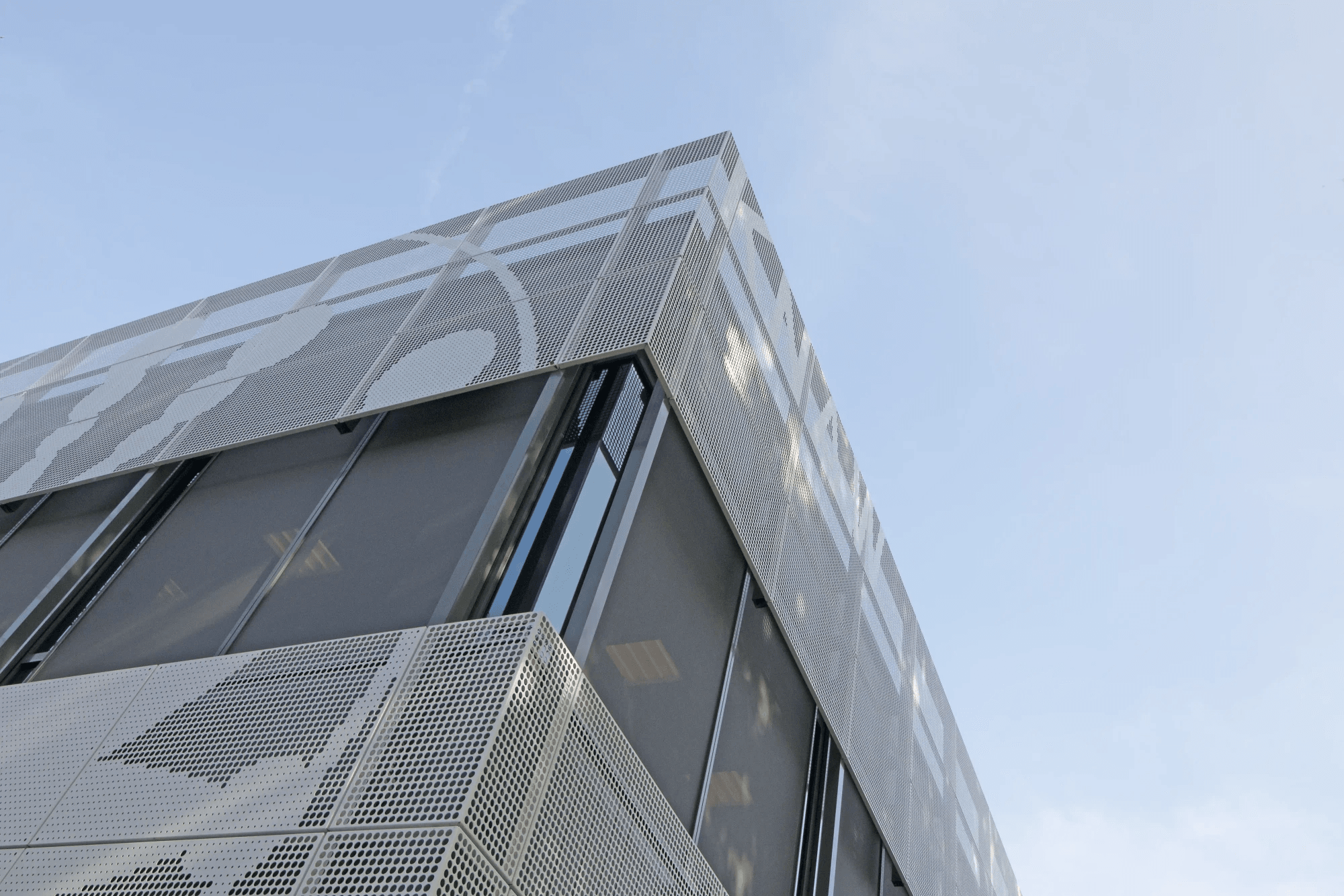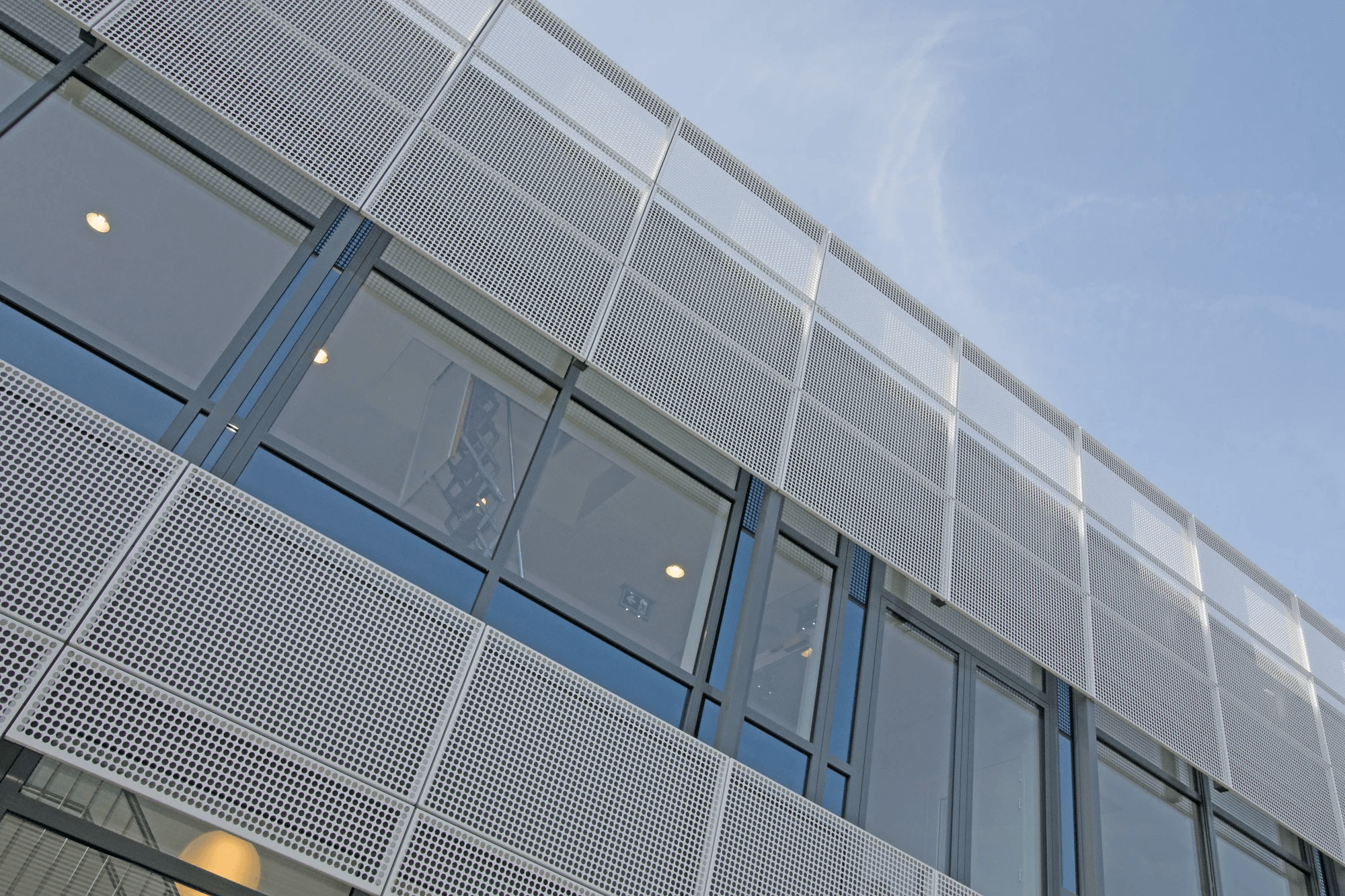 VPT heeft de complete gevelschil gerealiseerd waarbij een systeem van sandwichpanelen de isolerende laag vormen. De geperforeerde gevelbekleding vormt een integraal systeem met de sandwichbekleding. De gevel is voorzien van een speciaal perforatiepatroon, waarbij de letters en het logo uitgevoerd zijn in een afwijkend patroon. De geperforeerde gevel vormt een losse schil om het gebouw die gelaagdheid geeft aan het ontwerp. De geperforeerde panelen dragen tevens bij aan de zonwering voor de ramen.