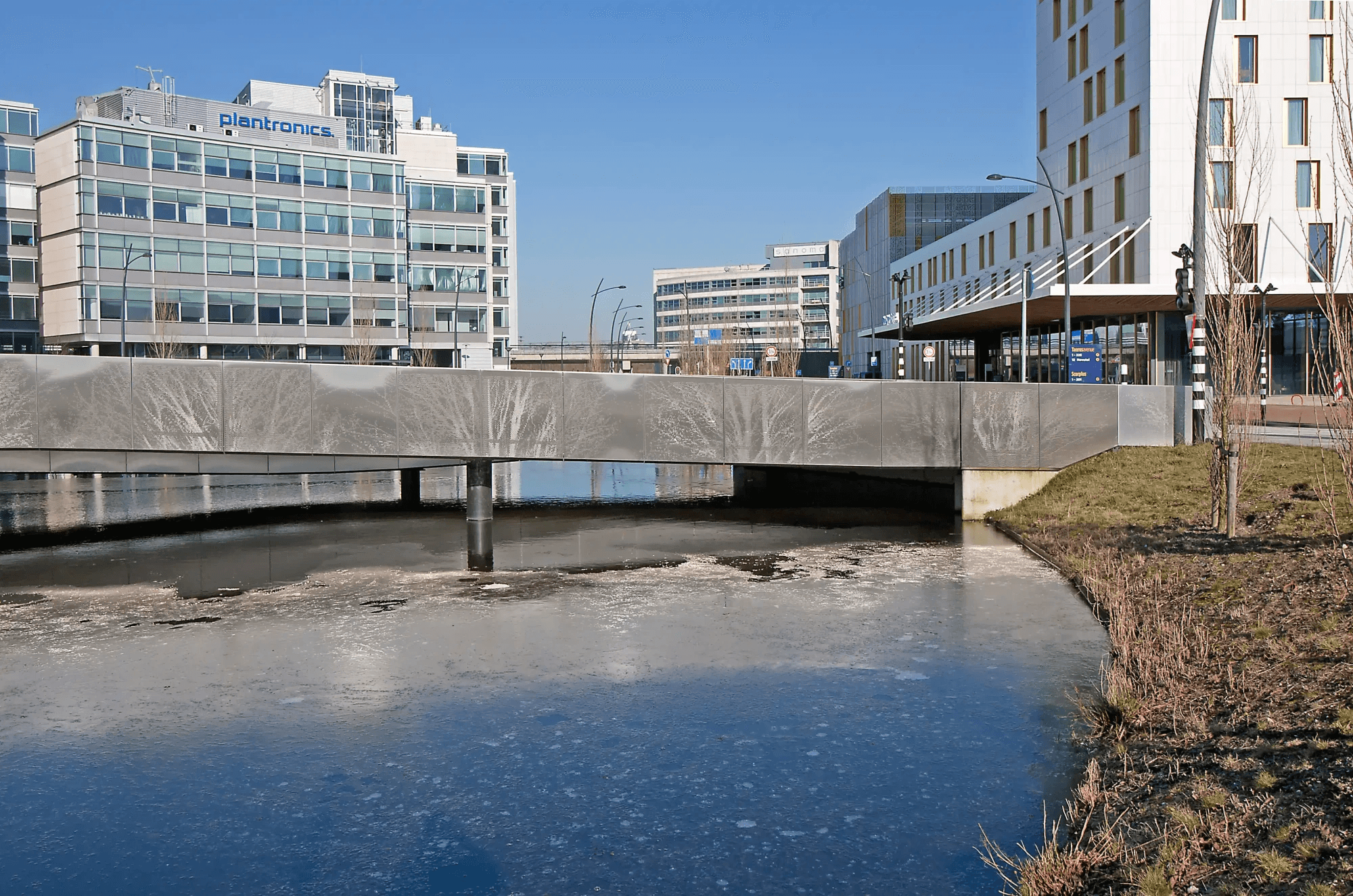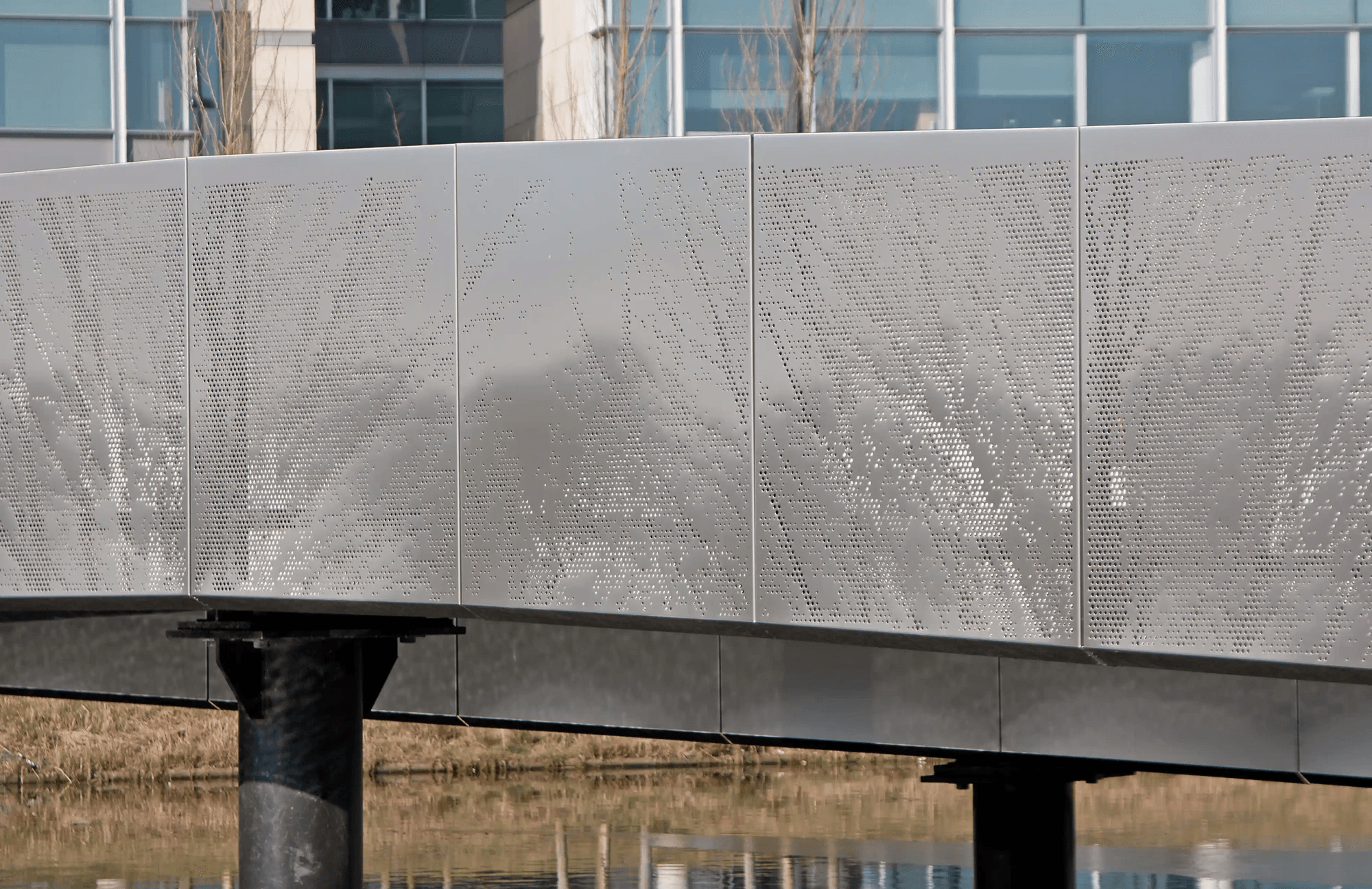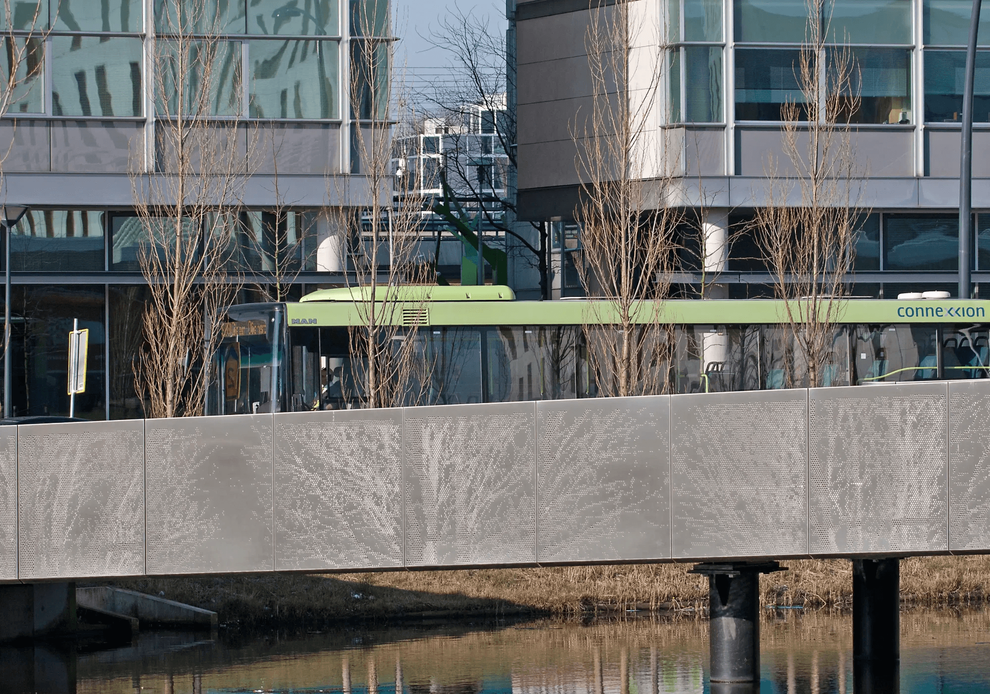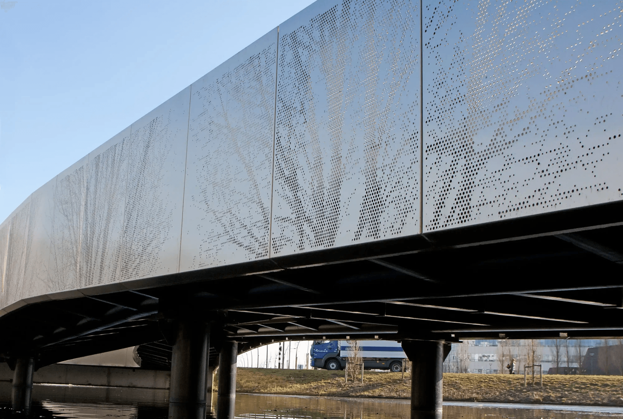 De brug is een object dat bekleed is met RVS panelen aan de buitenzijde van de brug. Langs het dek zijn de panelen uitgevoerd in gepoedercoat verzinkt staal. Omdat de lijn van de bekleding golvend is uitgevoerd en de afbeeldingspatronen zijn toegepast zijn alle panelen uniek. VPT realiseerde de complete rand langs het brugdek. Waarbij de constructie en LED verlichting integraal zijn opgenomen in het systeem.