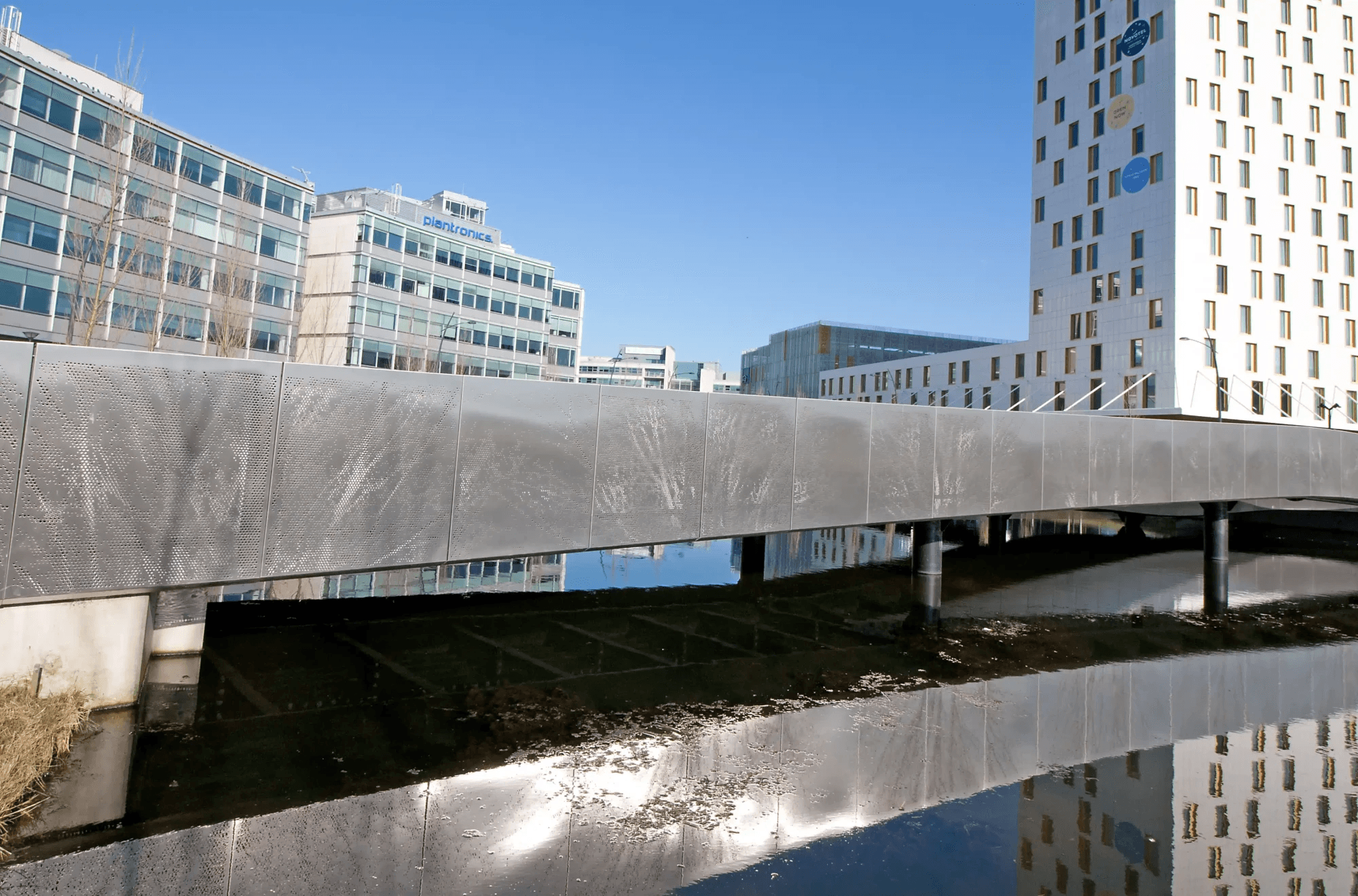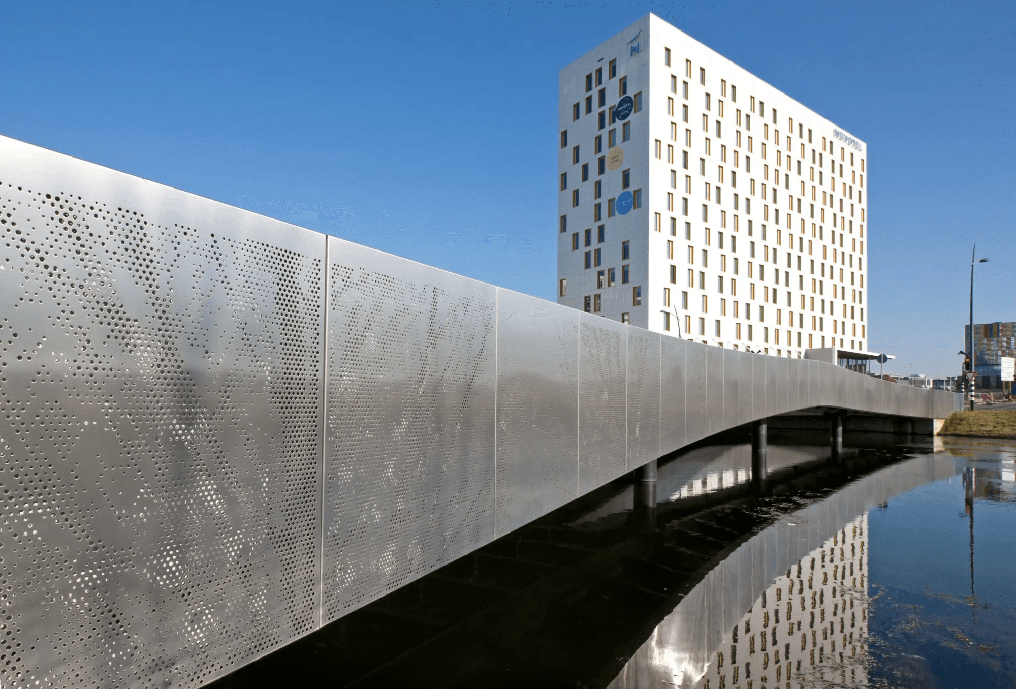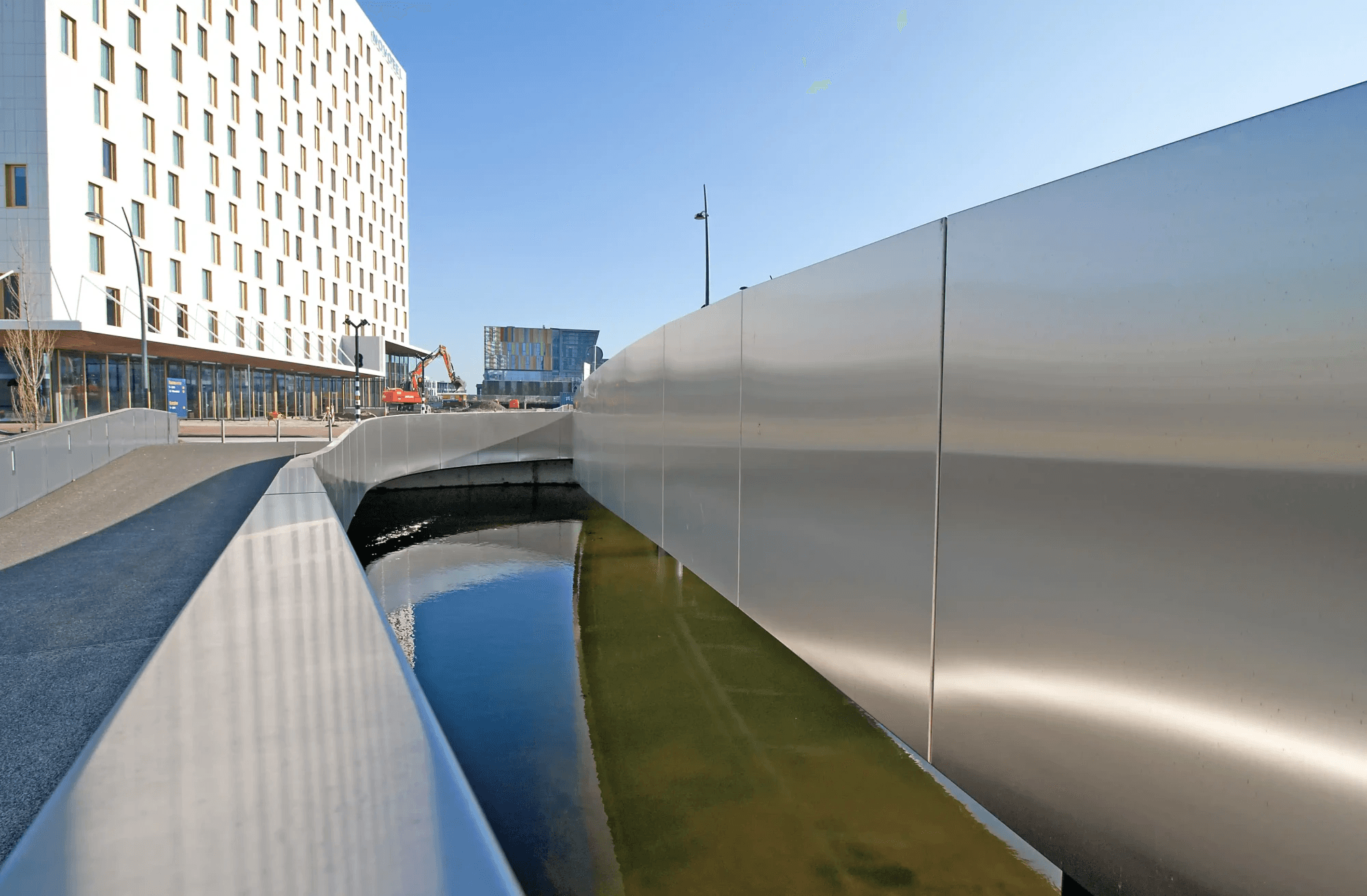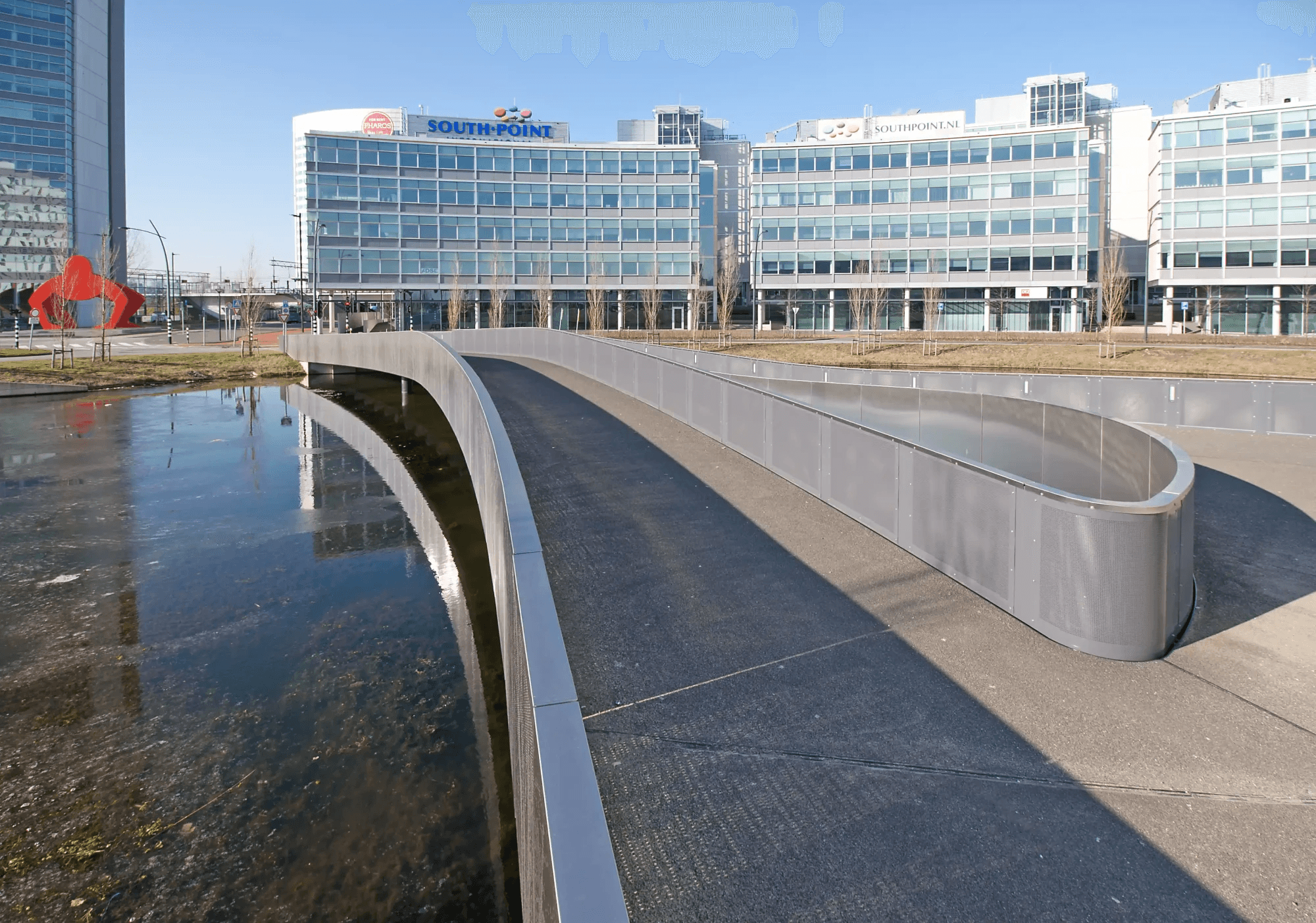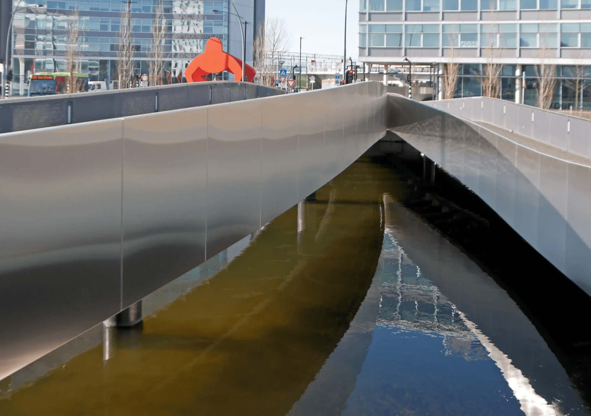 De brug is een object dat bekleed is met RVS panelen aan de buitenzijde van de brug. Langs het dek zijn de panelen uitgevoerd in gepoedercoat verzinkt staal. Omdat de lijn van de bekleding golvend is uitgevoerd en de afbeeldingspatronen zijn toegepast zijn alle panelen uniek. VPT realiseerde de complete rand langs het brugdek. Waarbij de constructie en LED verlichting integraal zijn opgenomen in het systeem.